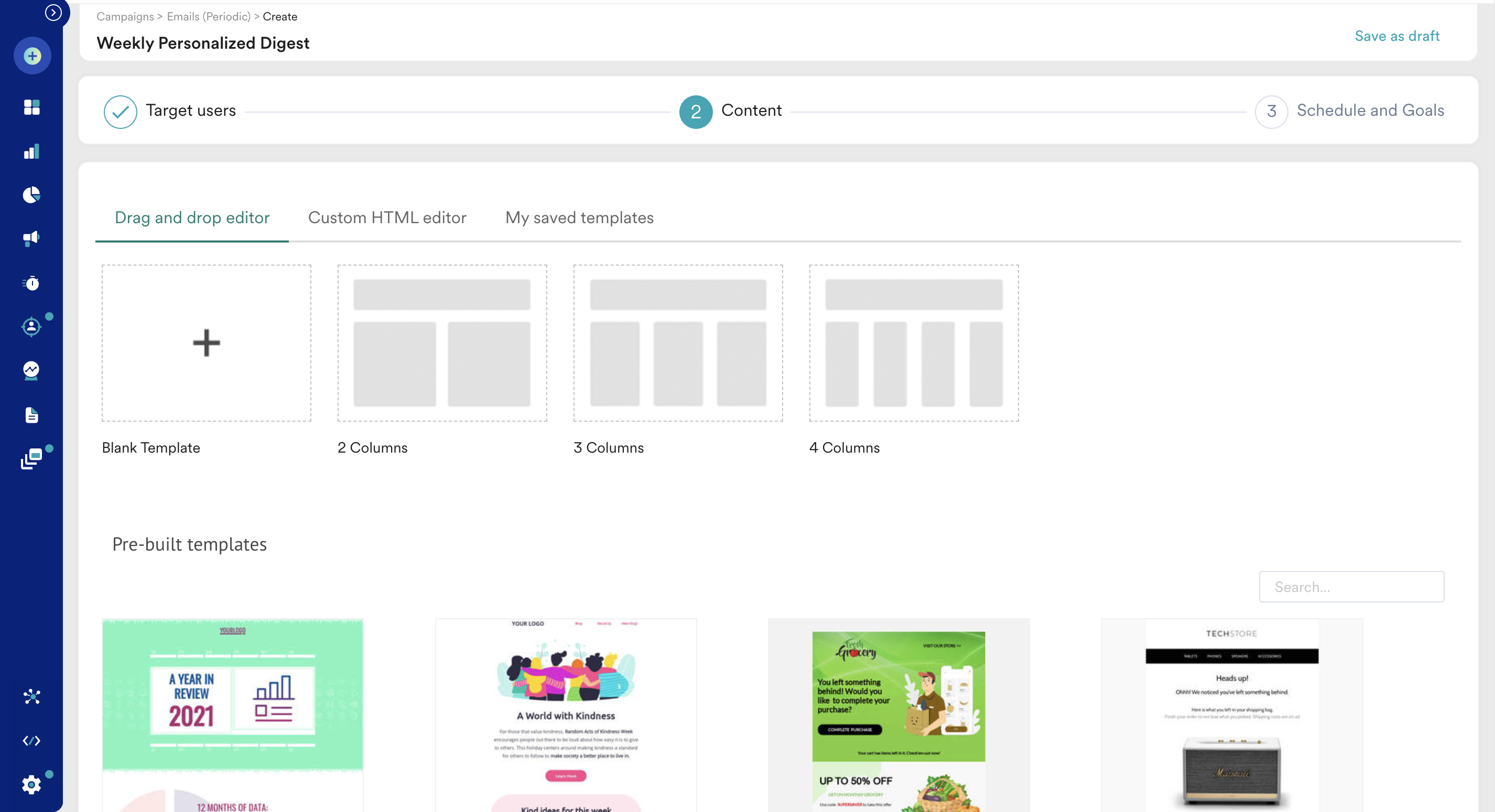 - In step 2, on the Content tab, click the Drag and drop editor tab and select a template from the available options. You can also select a template from Pre-built templates and customize it for your use case.