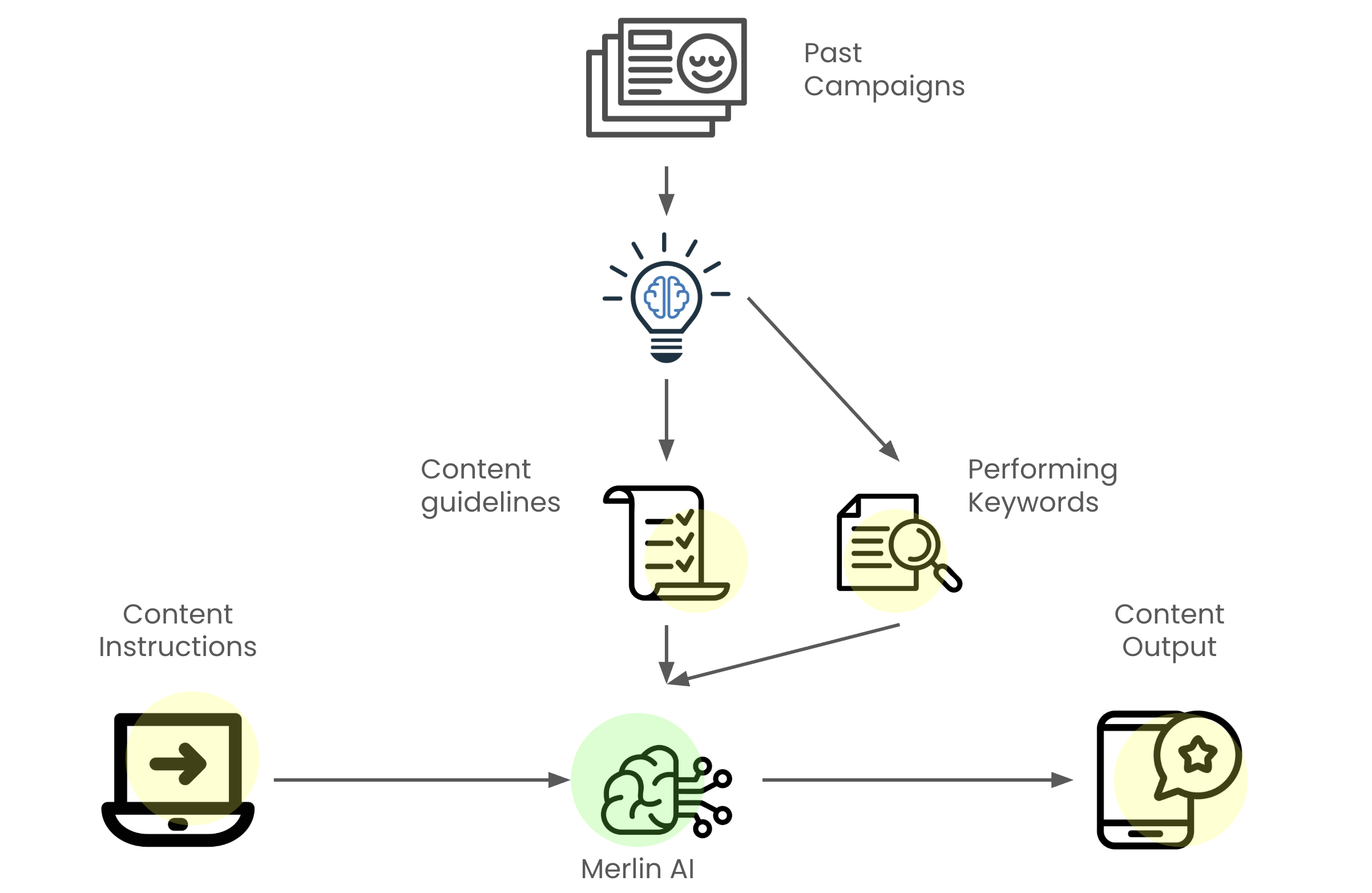 Merlin AI ensures that every piece of generated content is a true reflection of your brand, maintaining consistency without requiring manual oversight. It achieves this through a two stage process of learning from your past efforts and applying that intelligence to new content creation.