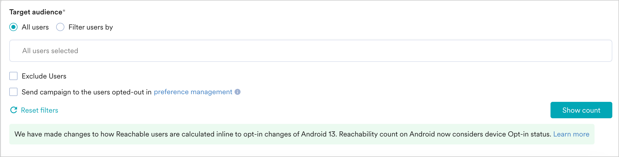 This section contains segmentation filters that help you choose the target audience for your campaign. The following options are available: