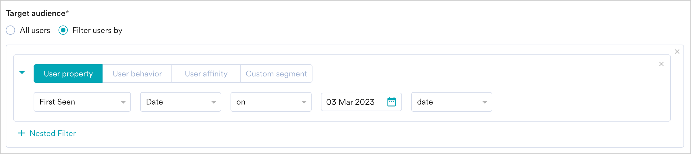 This filter option allows you to target the users based on user properties such as first seen, last seen, city, and so on. Select the User property tab and do the following: