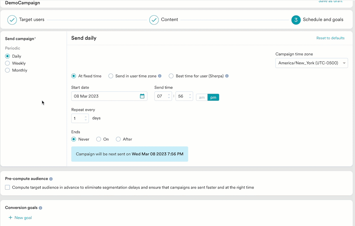 - Send the campaign to the user at the start time by selecting Yes, send at start time.