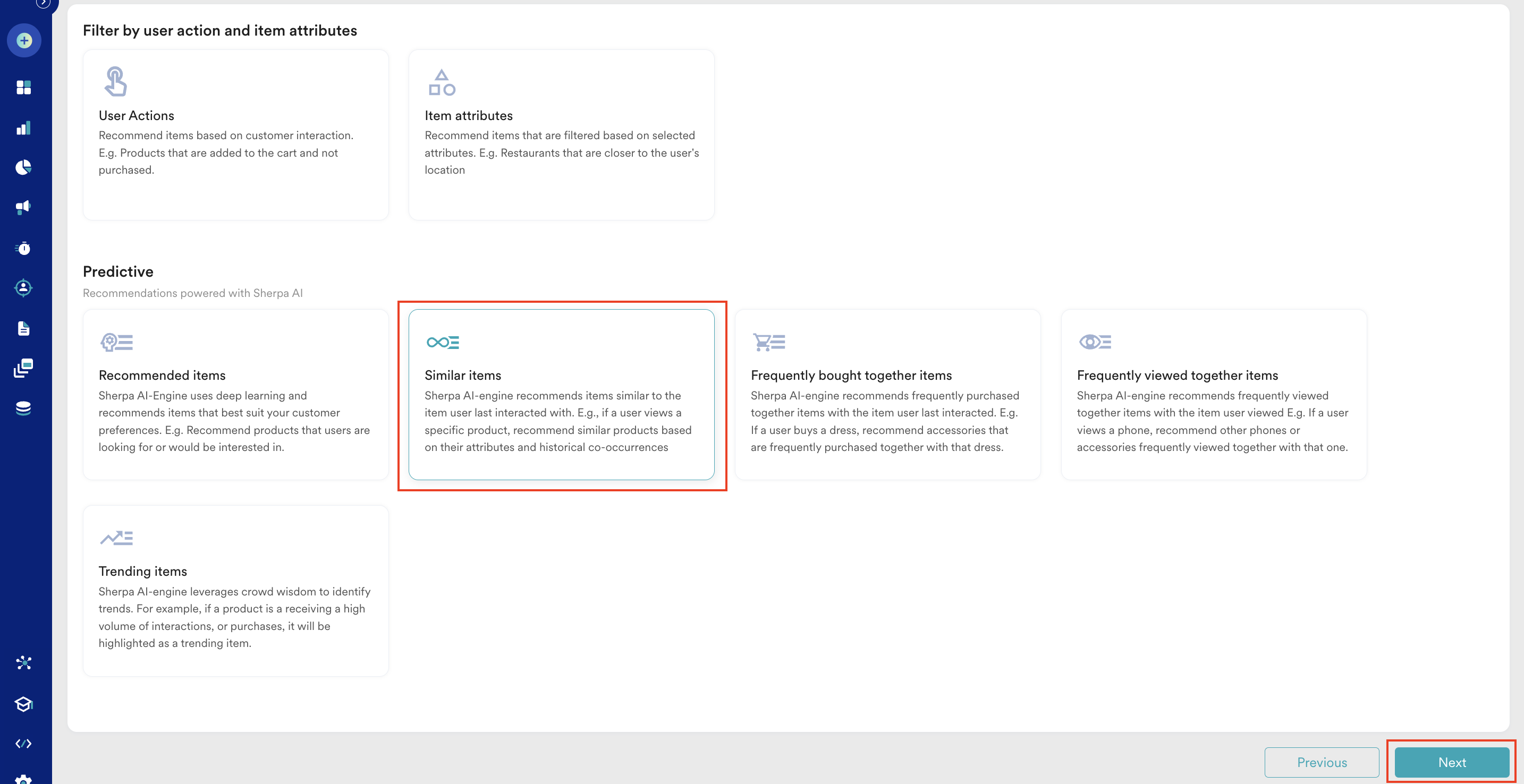 - Under Predictive, click the Similar items card because it considers the user's action of watching content and related information in attributes such as the genre, director, and cast. This model uses Merlin AI to predict what other content the same user would prefer.