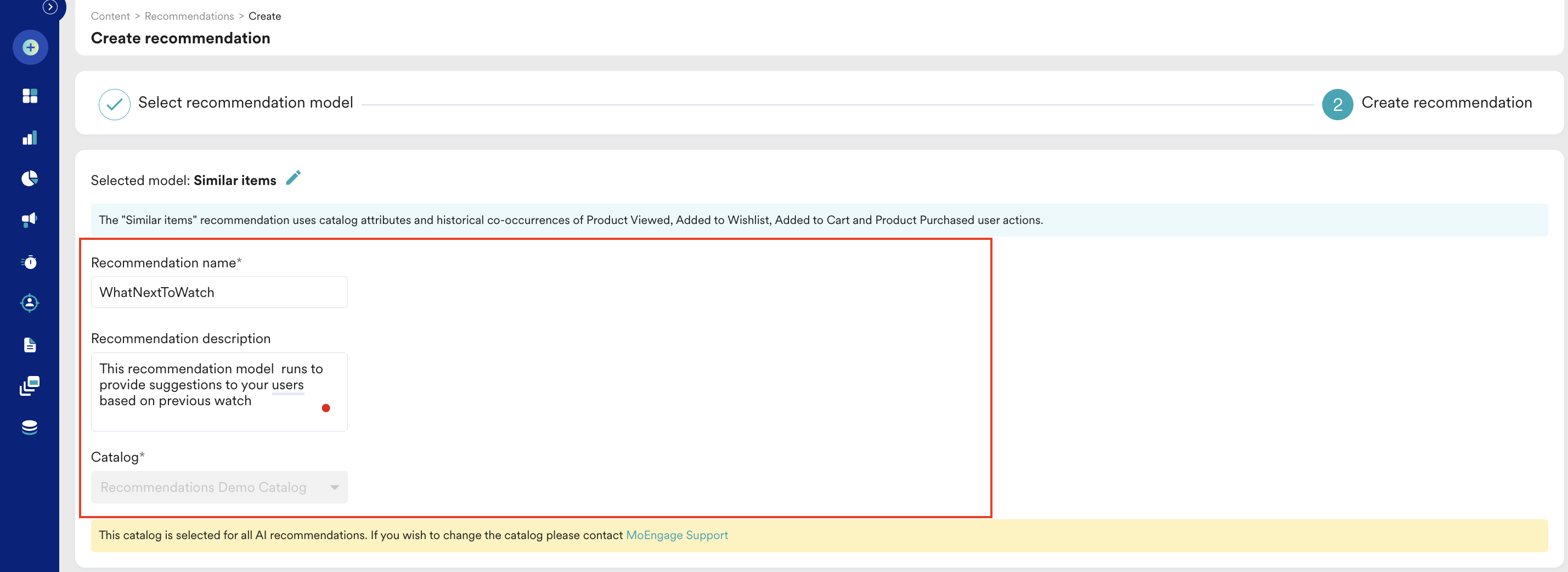 Catalog: Select the catalog to which the recommendation is to be applied. In this example, we will select Recommendations Demo Catalog.