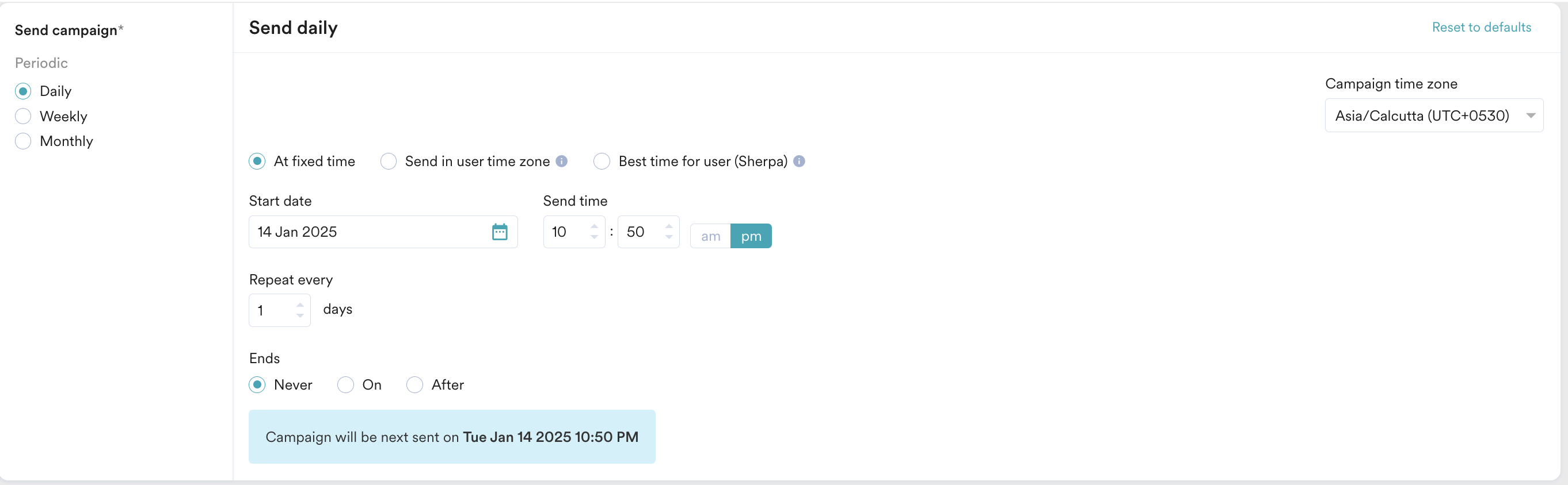 - In the Send campaign section, define when you want to start and end your campaign.
