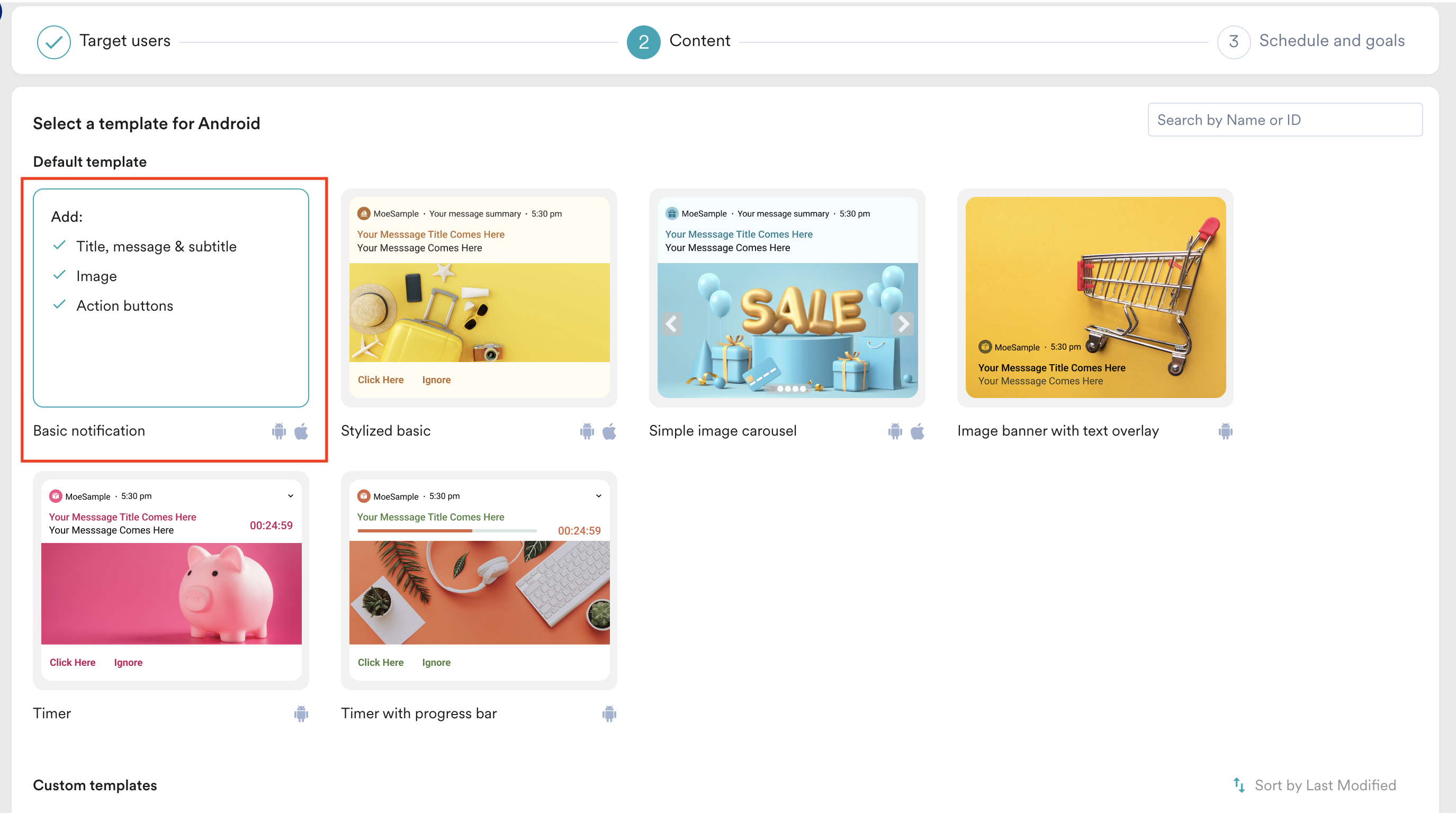 You will move to the second step, Content, to define the content for your Push campaign.