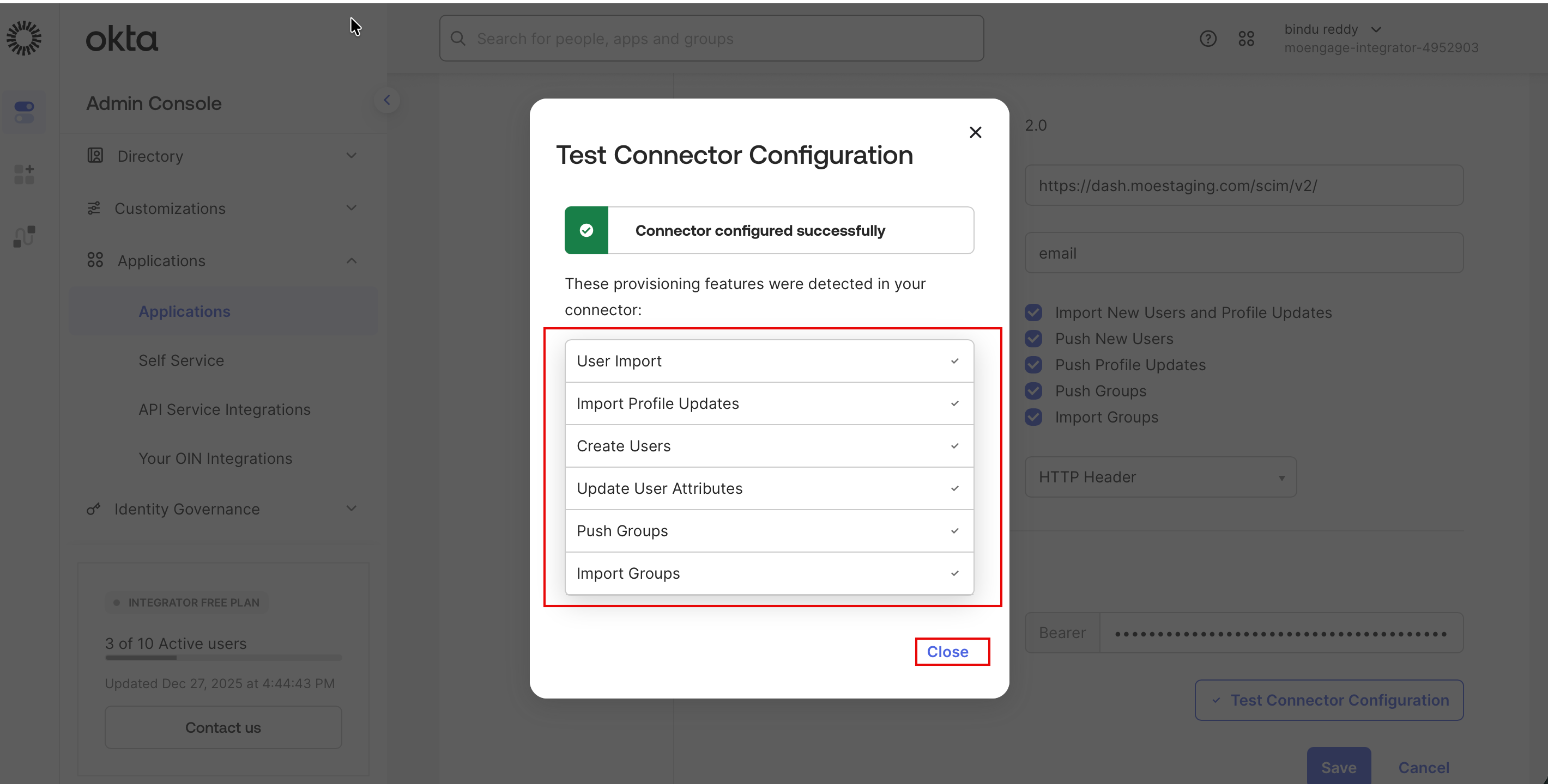 A Test Connector Configuration dialogue box appears (this process may take up to 30 seconds). The connector configured successfully message appears to review the following list of provisioning features detected in your connector:- User Import and Import Profile Updates: This confirms that Okta fetches user data from MoEngage.