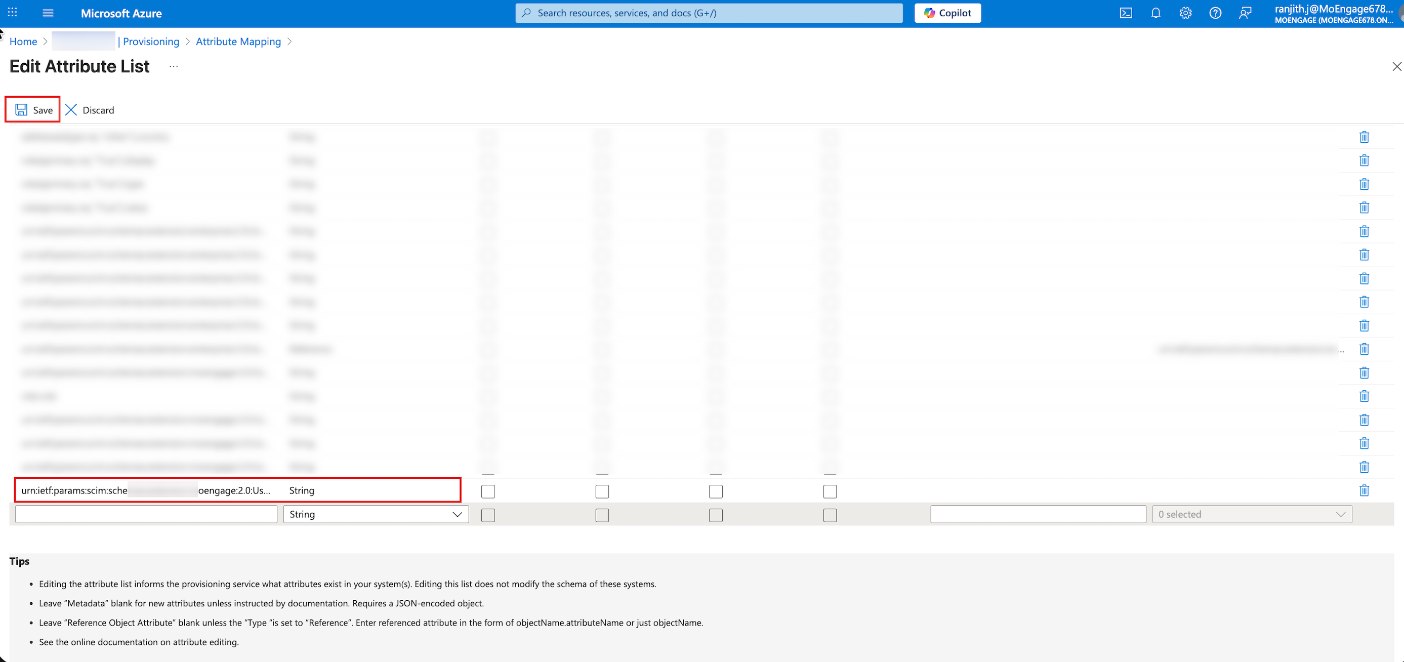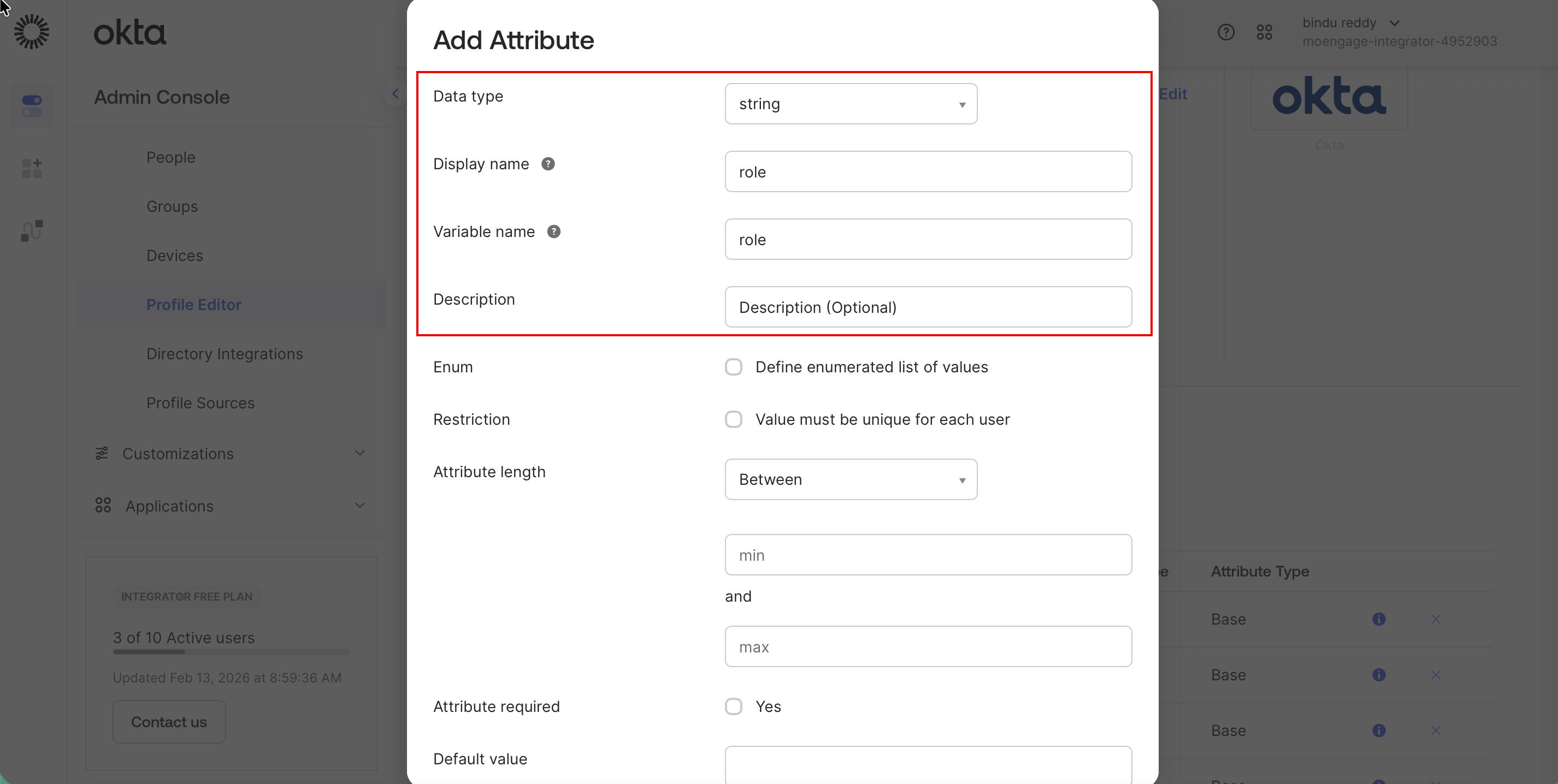 - Name: Enter the attribute name. urn:ietf:params:scim:schemas:extension:moengage:2.0:User:role