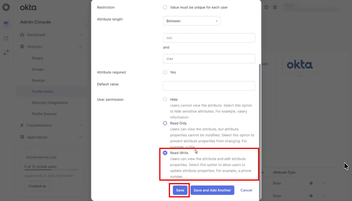 Attribute required: Select the Yes check box to enforce that a role is provided during the user invitation process in Okta.
