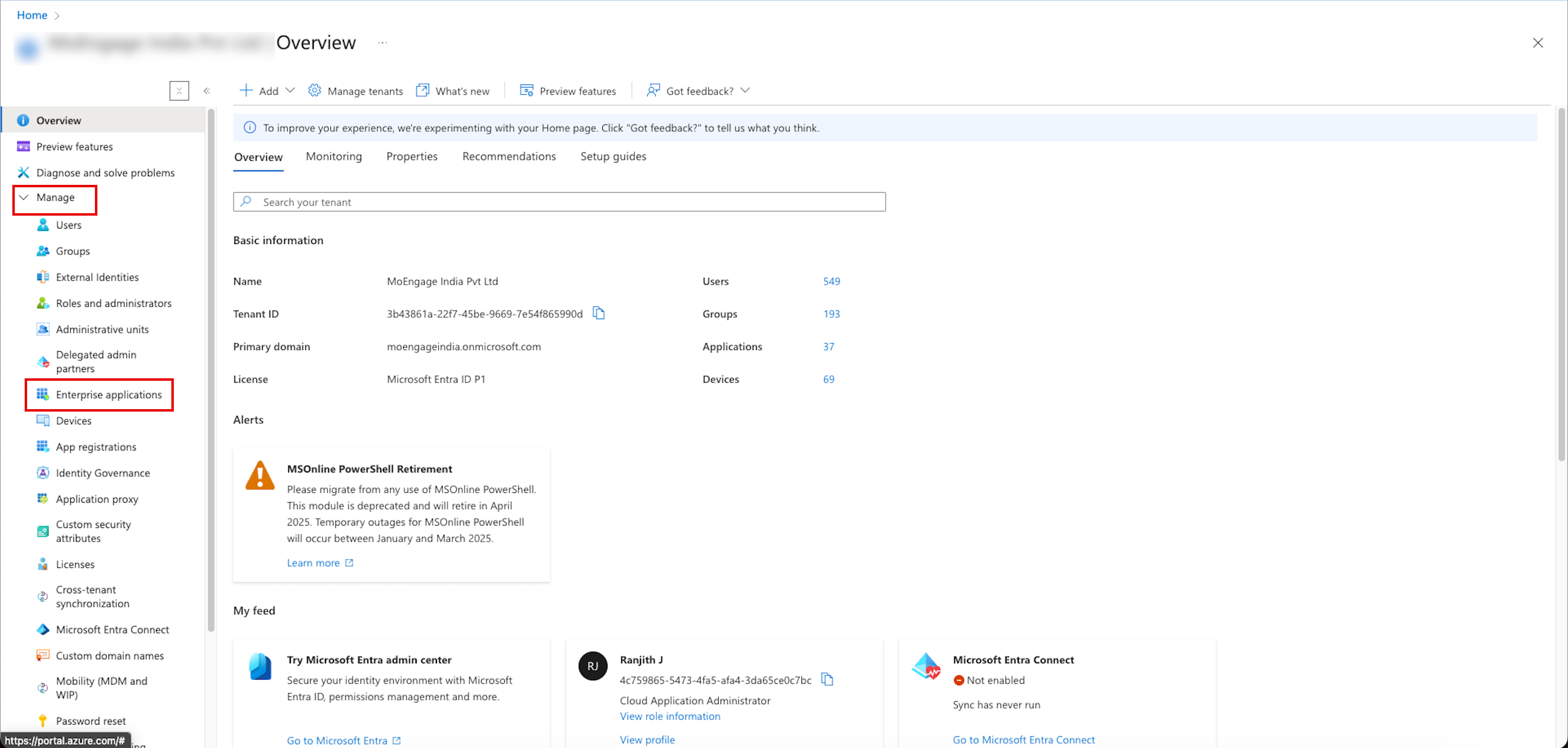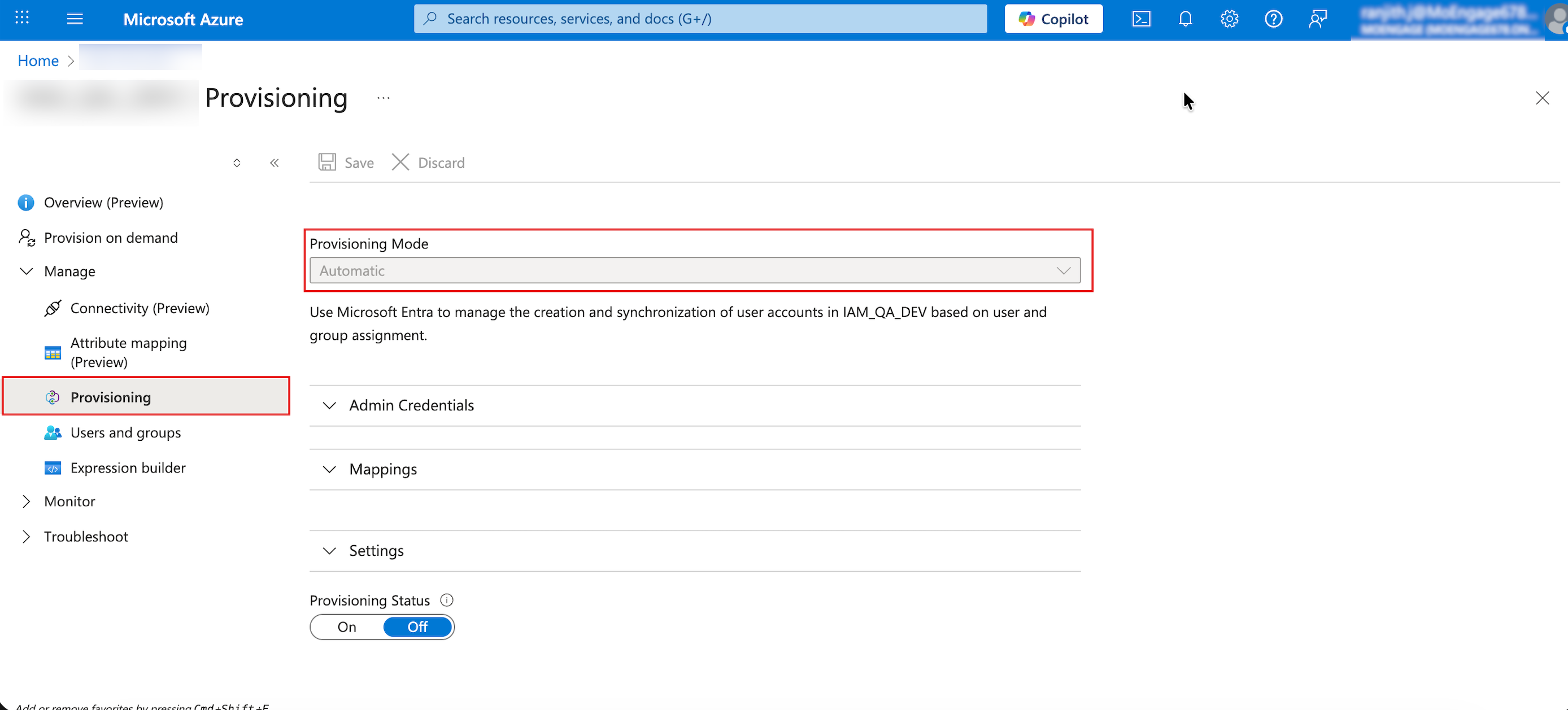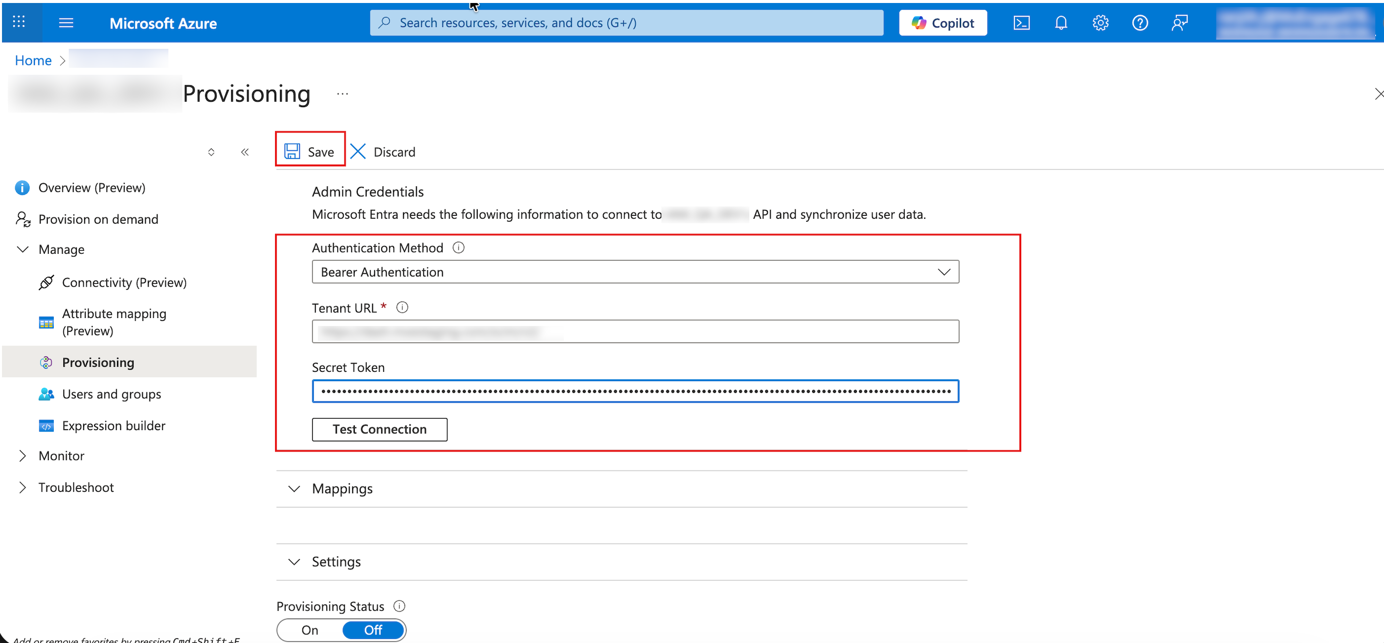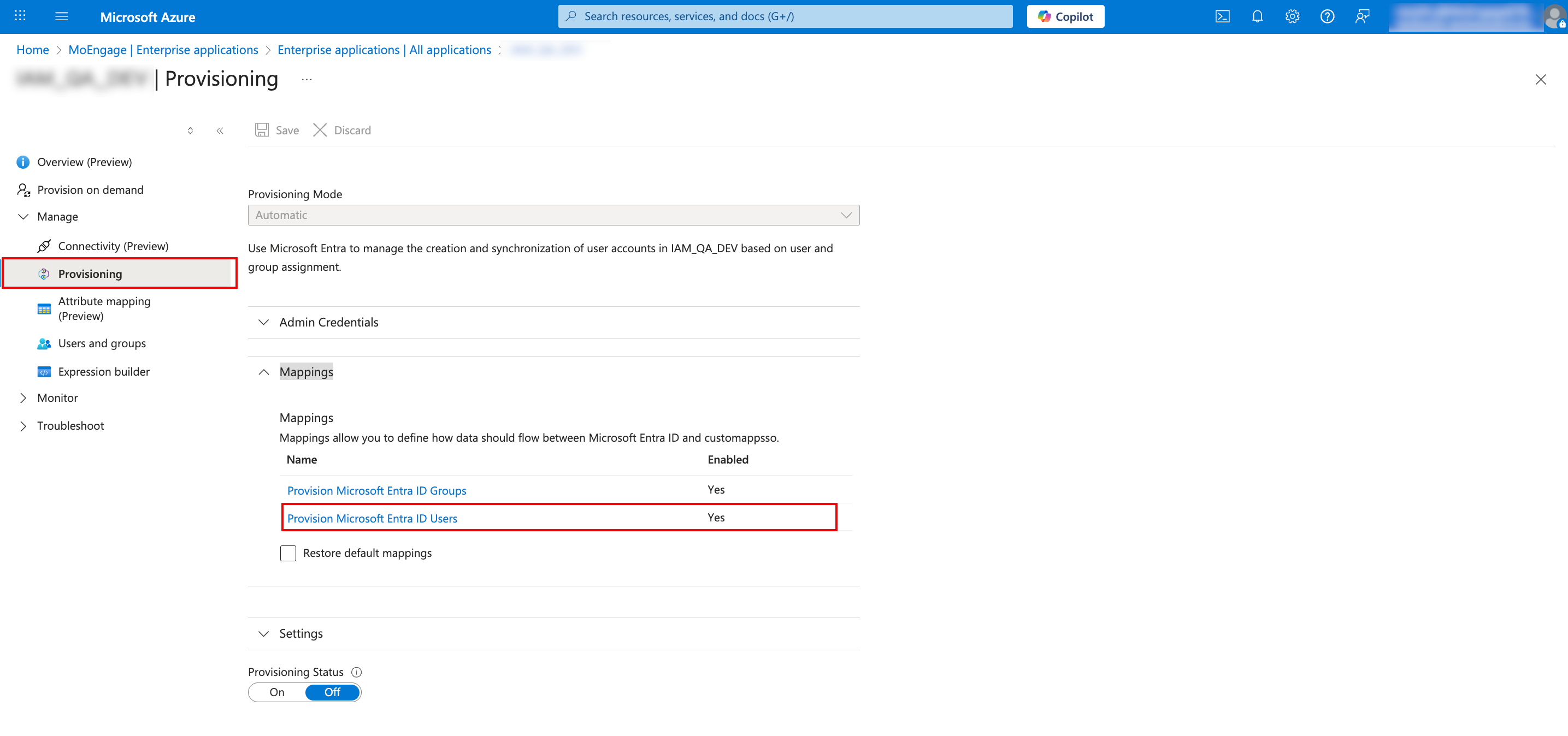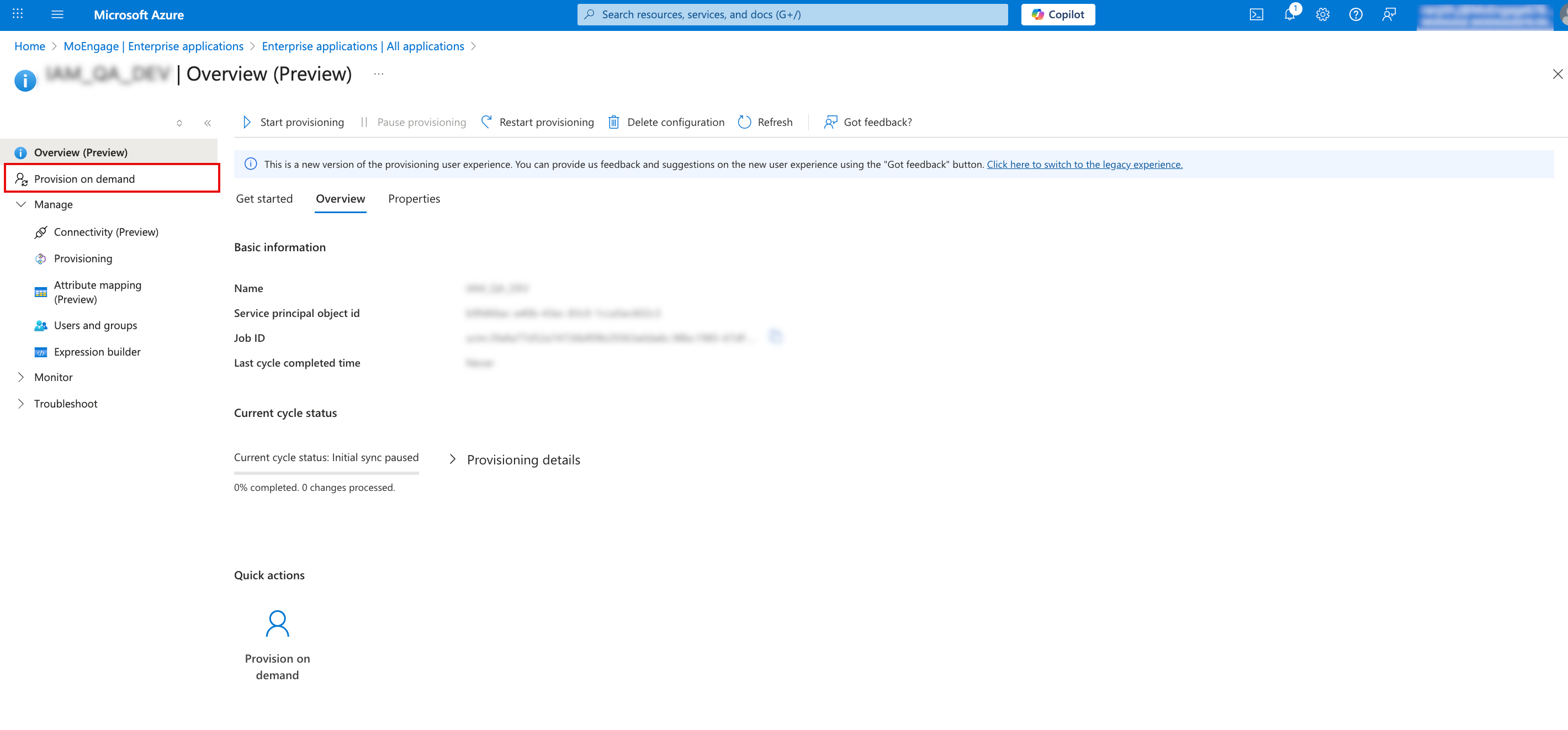 - Return to the Azure application, on the Overview page, go to the left navigation menu, and click Manage > Provisioning.