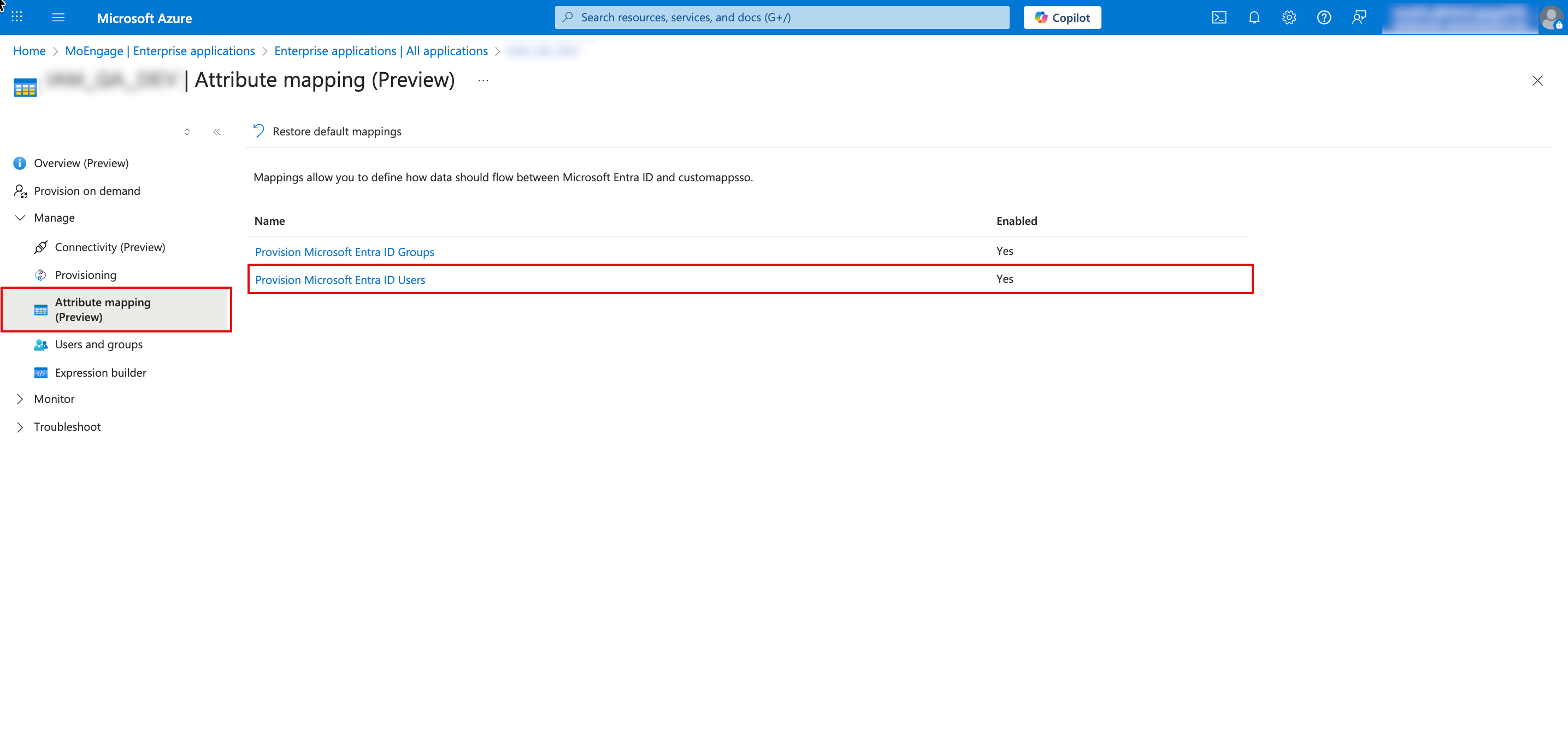 - In the Provisioning section of your Azure application, expand Mappings and click Attribute mapping (Preview).