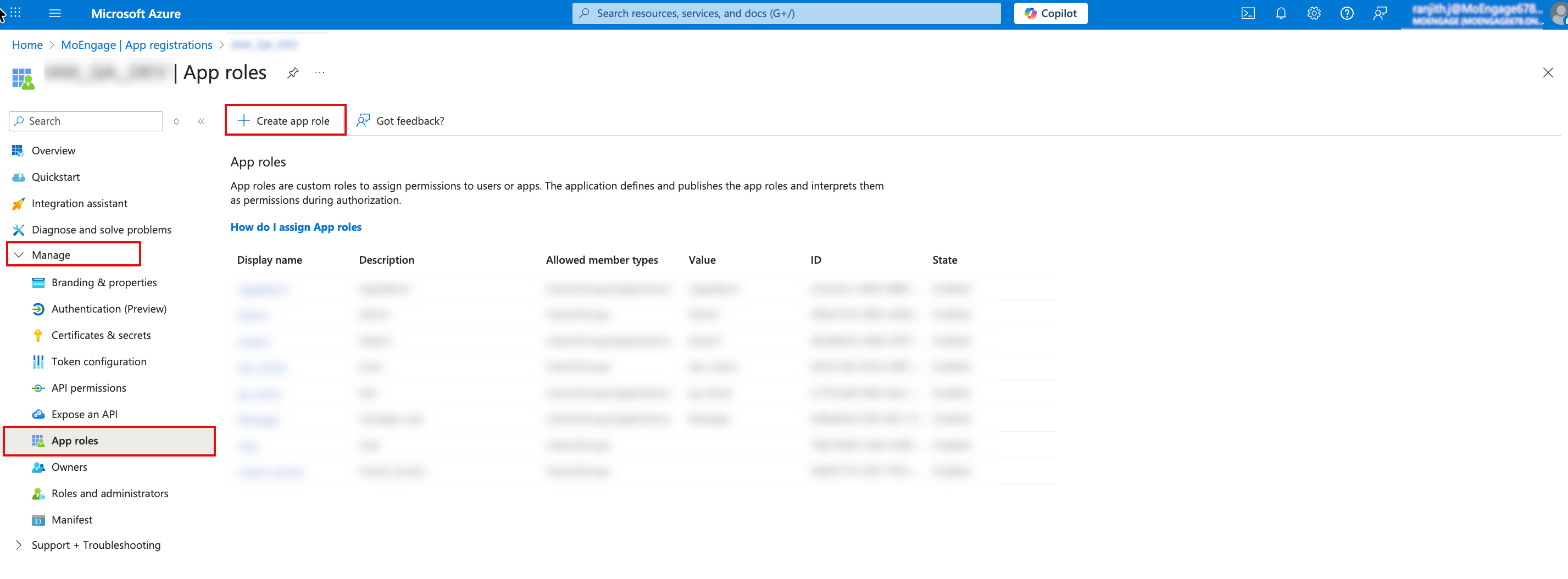 - In the left navigation menu, click Manage > App roles.