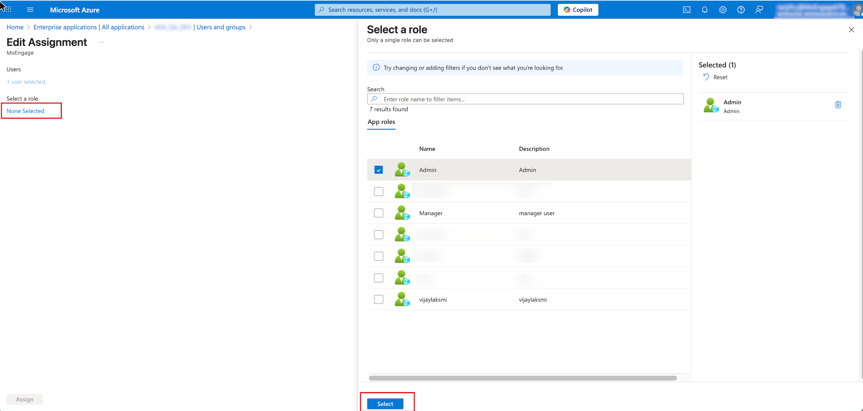 The Select a role dialog box pane appears on the right side. A list appears displaying the custom App Roles created in Step 5.1. - Select the appropriate role from the list and click Select.
