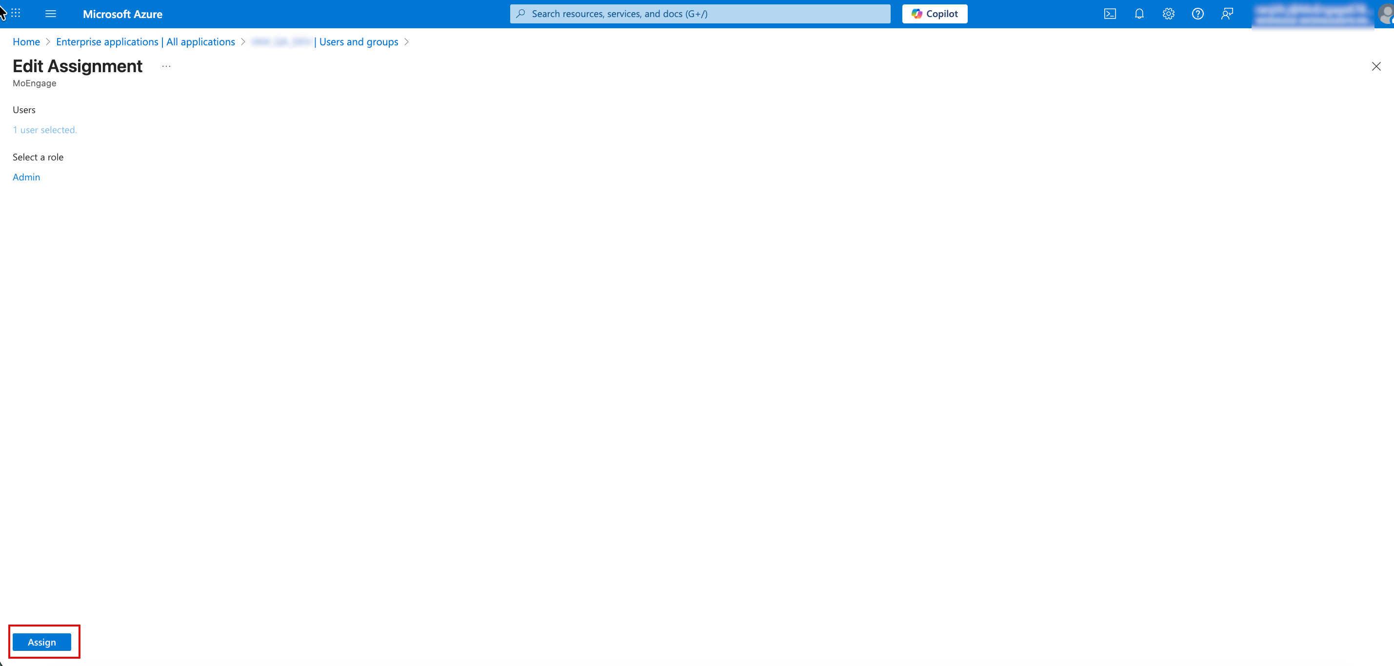 Note: Ensure you do not leave the role as Default Access. Microsoft Entra ID requires a specific role value to pass the correct permission data to MoEngage during the SCIM synchronization. - Click Assign at the bottom of the Edit Assignment page.