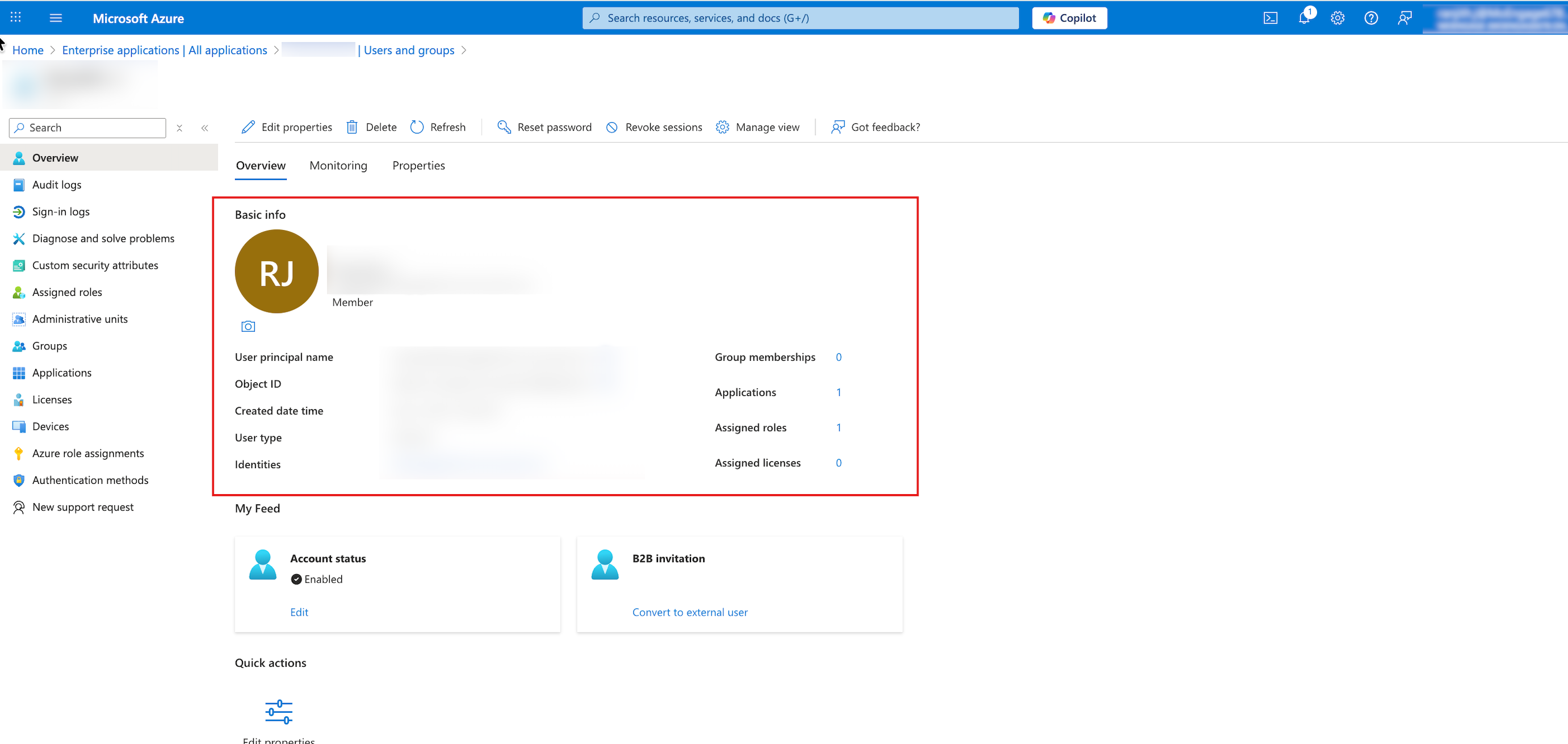 After Microsoft Entra ID successfully updates the user, the Application assignment succeeded message appears in the upper-right corner. - To verify the assignment, click the user's name to open their Overview page. The Basic info section displays the user's User principal name and confirms that the number of Assigned roles is now updated.