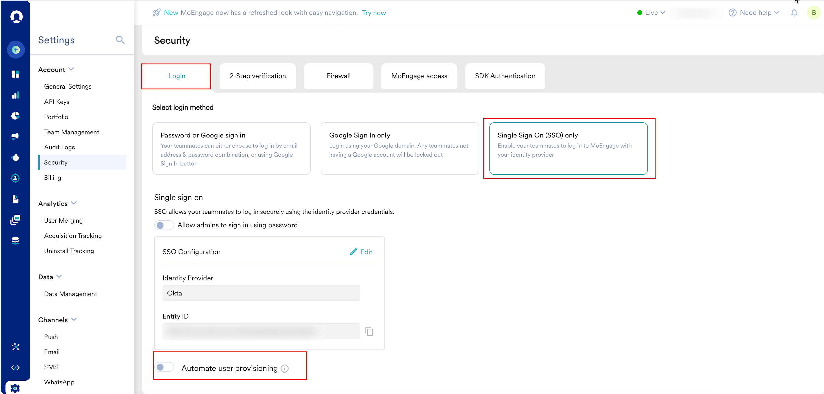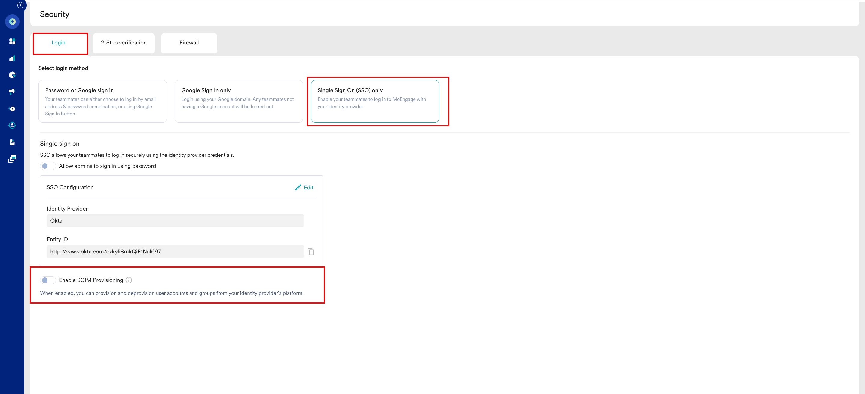 - A working single sign-on (SSO) configuration for your MoEngage workspace.