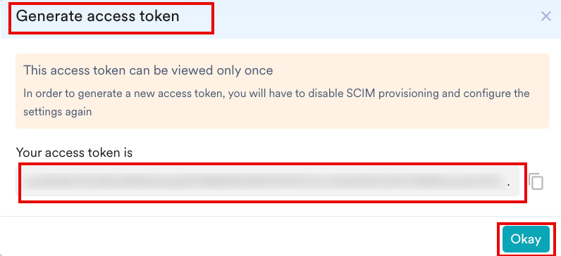 Note: You can view the access token only once; ensure to copy it. - Click Okay.