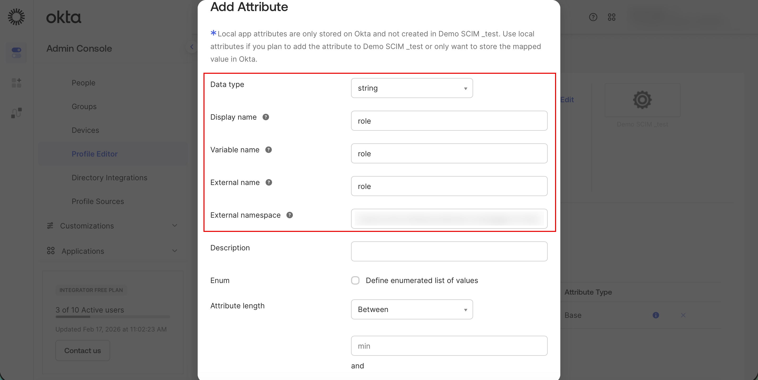 - In the External namespace, enter urn:ietf:params:scim:schemas:extension:moengage:2.0:User