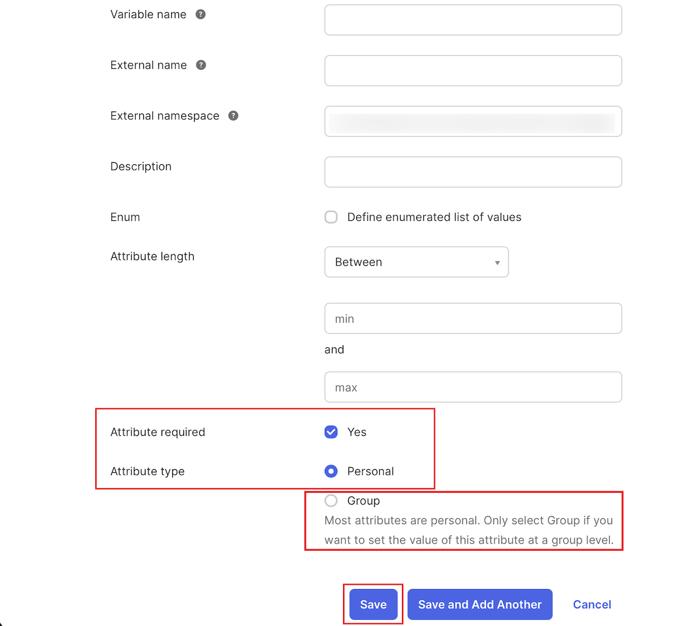 Ensure that the External namespace is set to role and the Attribute required setting is enabled (set to True).