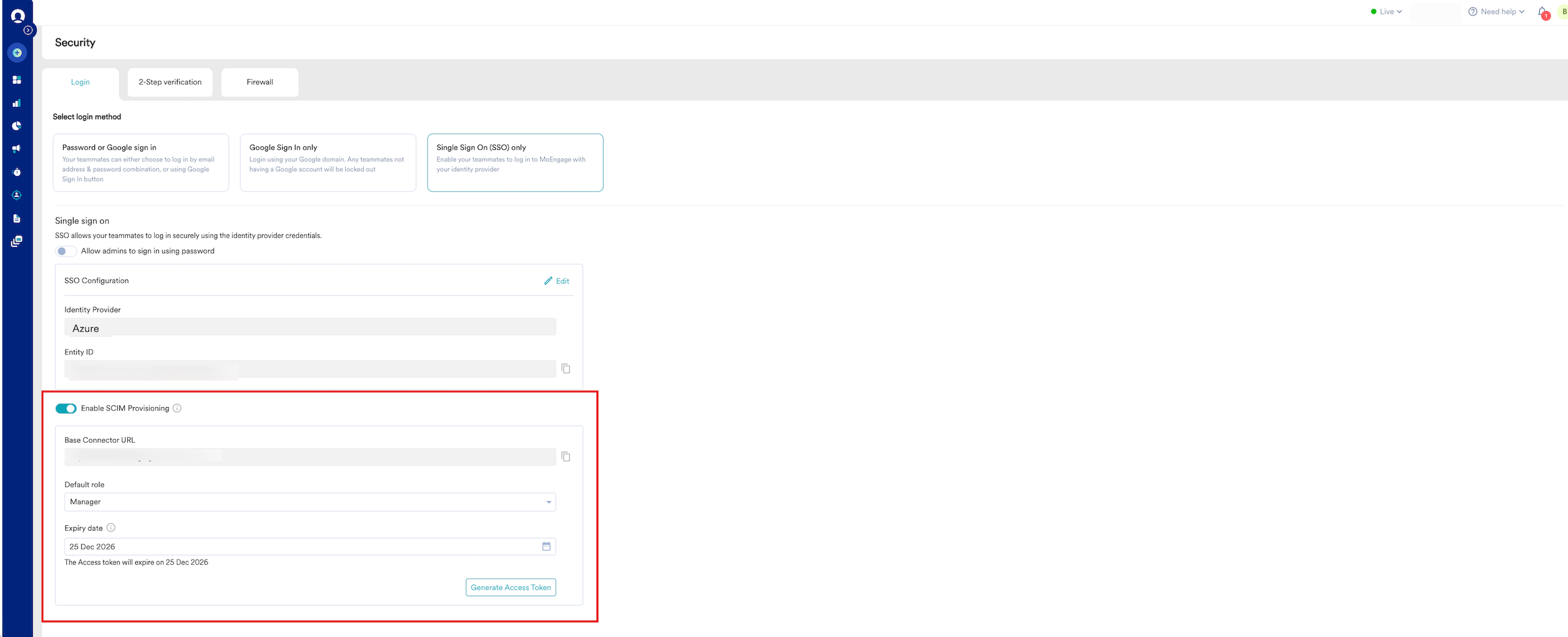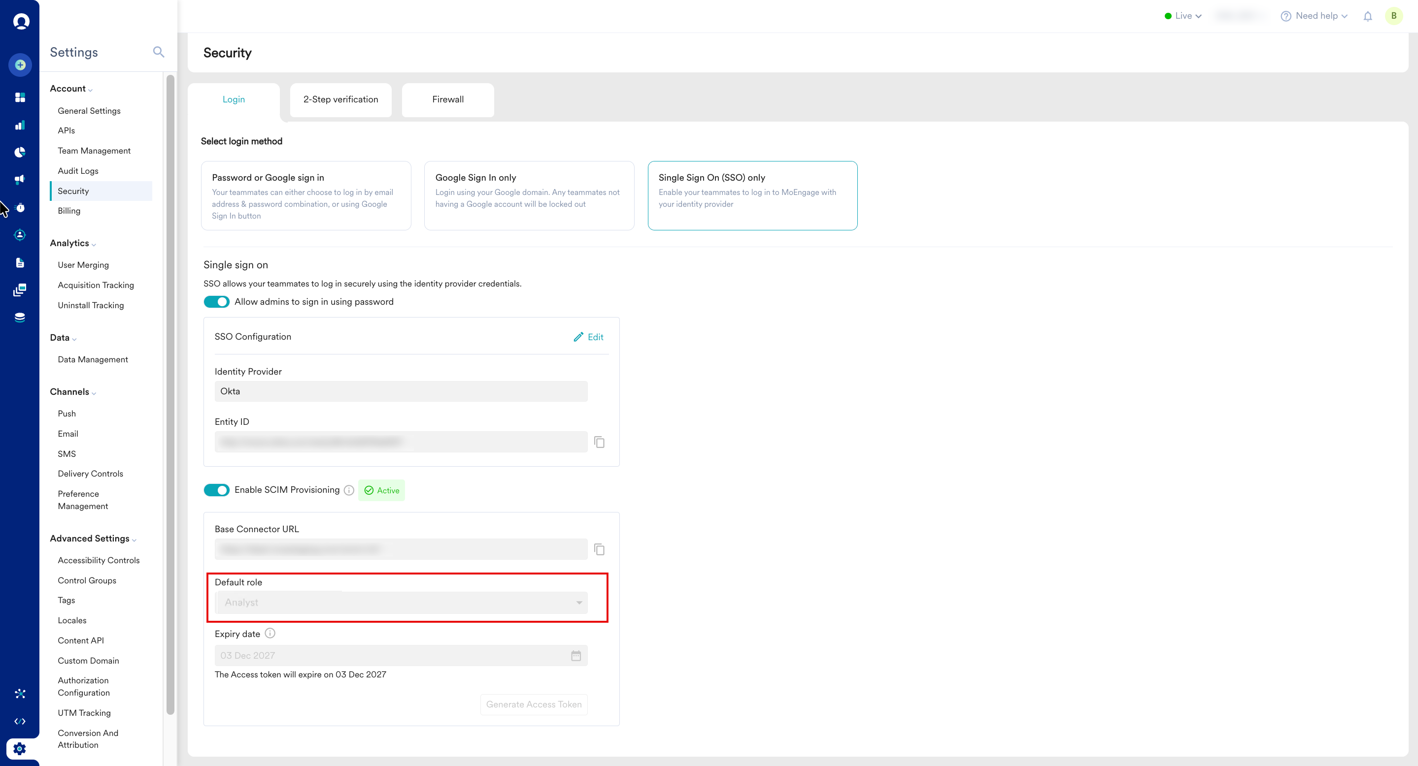 To configure SCIM on MoEngage and generate a token, perform the following steps: