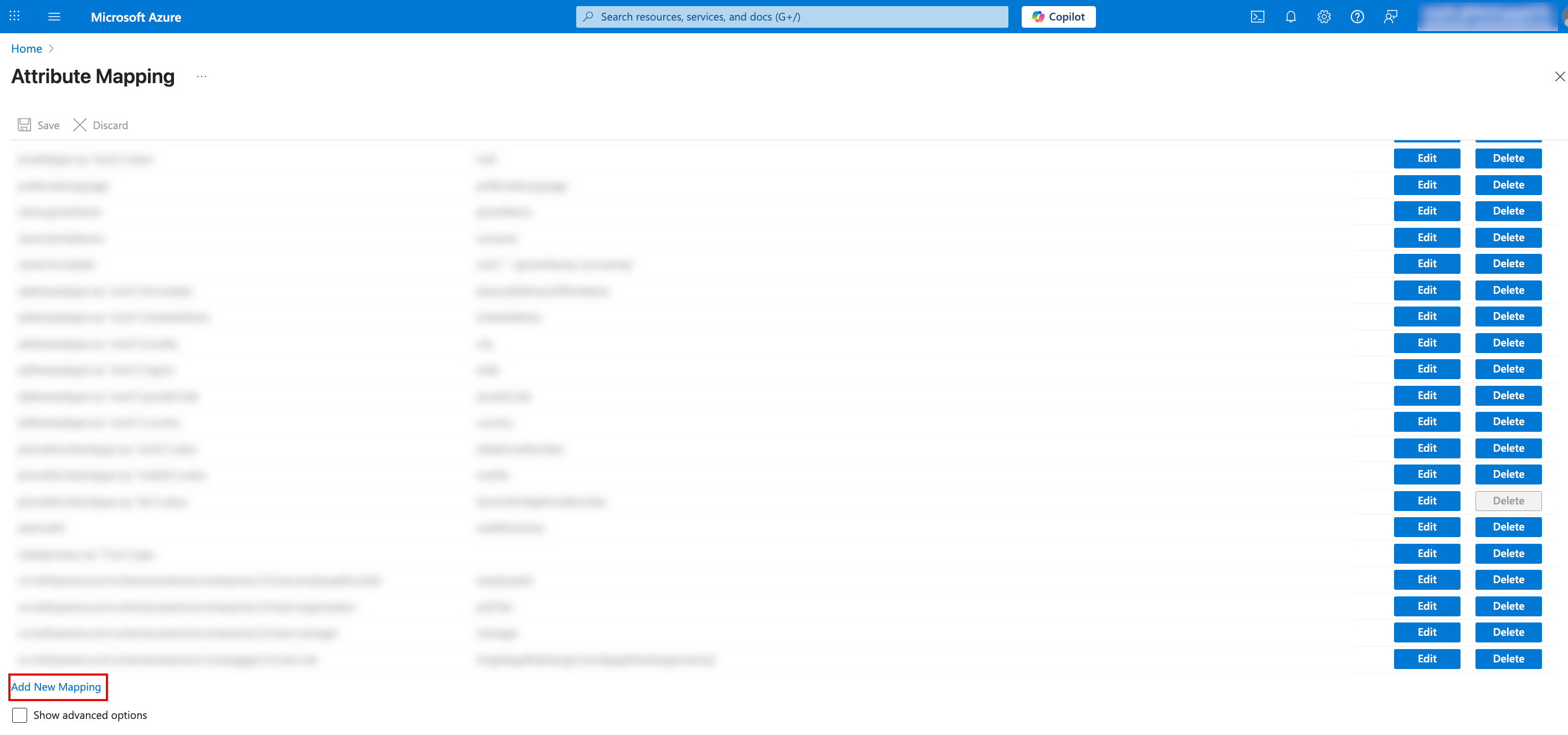 - Scroll to the end of the Attribute Mapping page and select the Show advanced options check box.