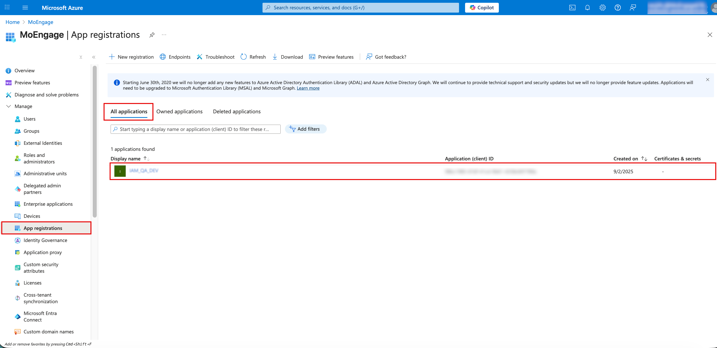 - Navigate to Home > Microsoft Entra ID > Manage > App registrations.