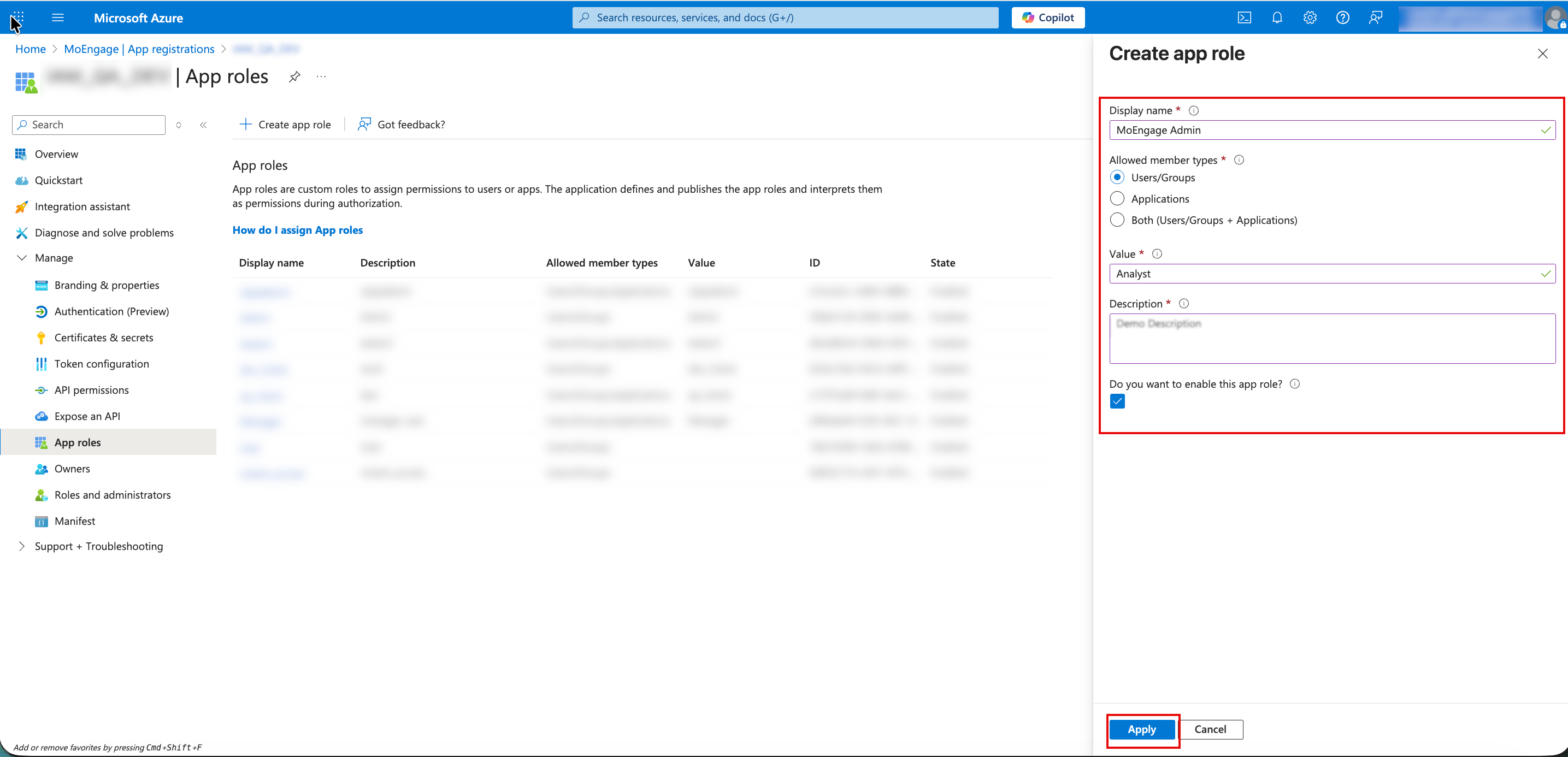 Note: When entering the Value for the role, ensure it matches the exact role name defined in your MoEngage workspace. Microsoft Entra ID uses this value to pass the correct permission data during the SCIM handshake. - In the Description box, type a brief description of the permissions this role provides.