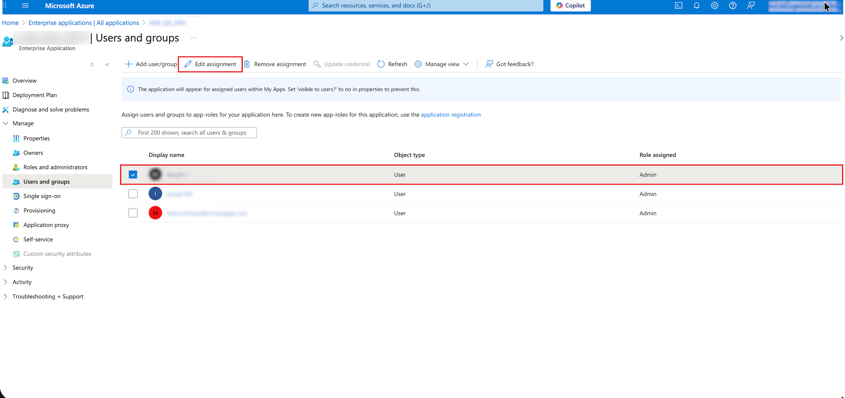 - Select the check box for the user you want to update and click the Edit assignment icon