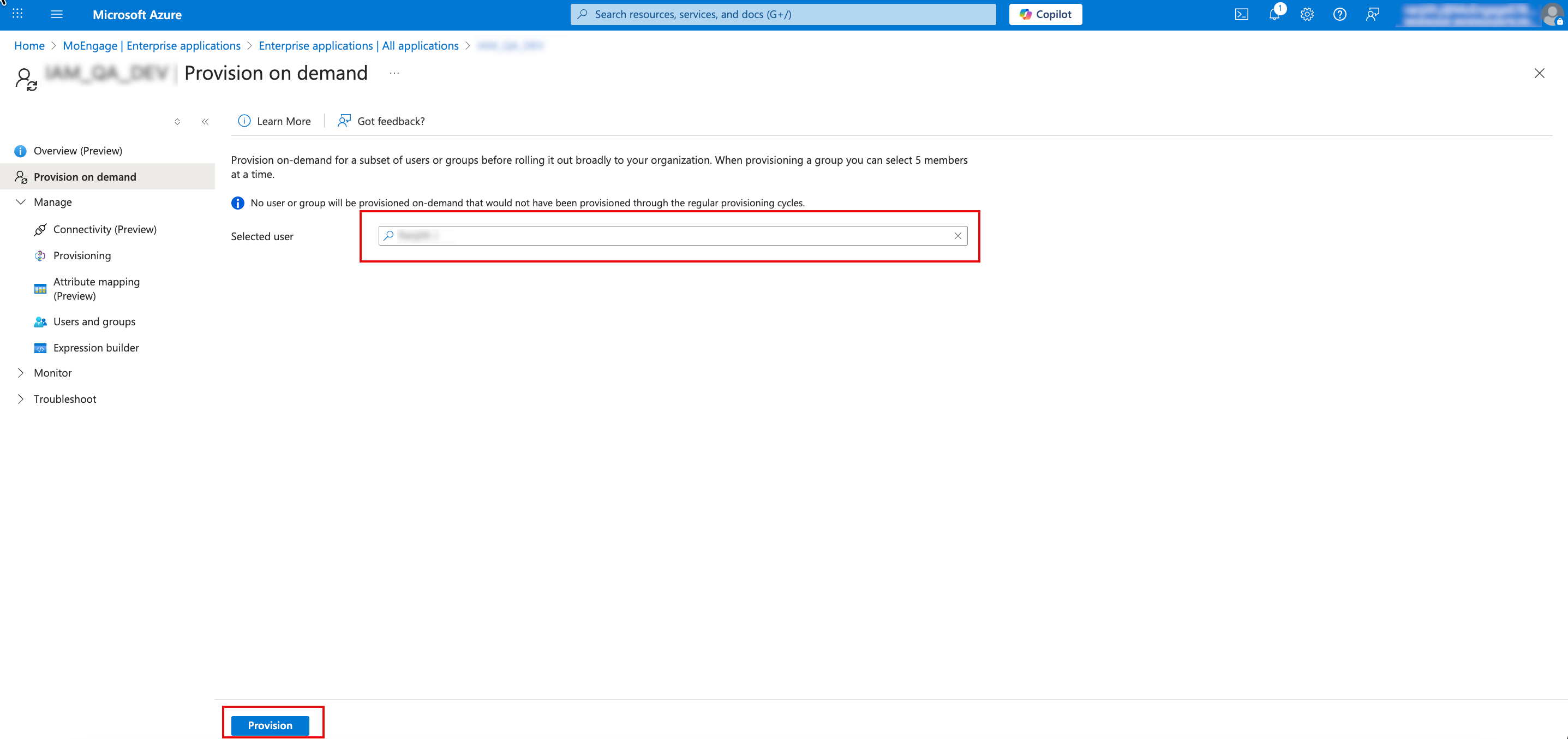 - Click Provision at the bottom of the page. Microsoft Entra ID initiates an immediate "force push" of the user identity, including the custom MoEngage role mapping.