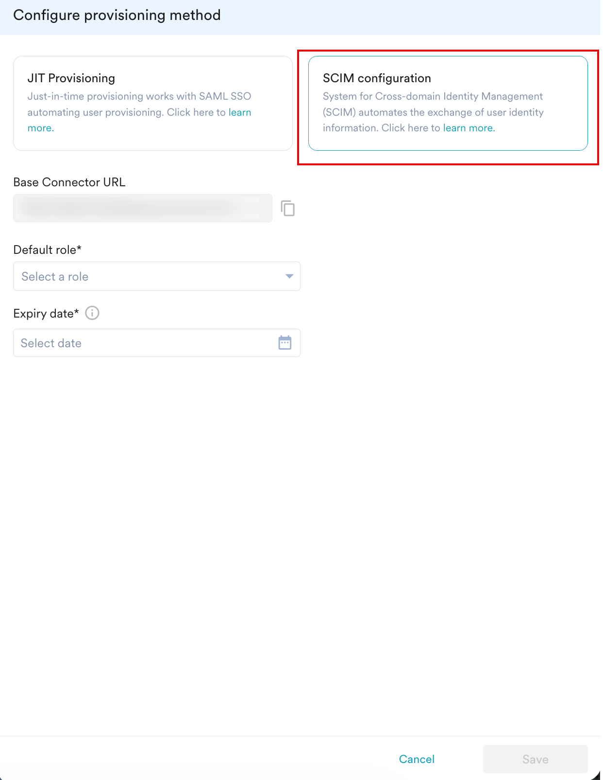 The Configure provisioning method dialog box appears. - Click SCIM configuration as your configuration type.