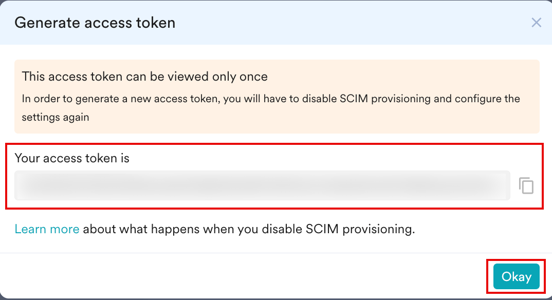 The Successfully generated SCIM token message and the Generate access token dialog box appear. Note: Copy the token immediately; it is only shown once. - Click Okay.