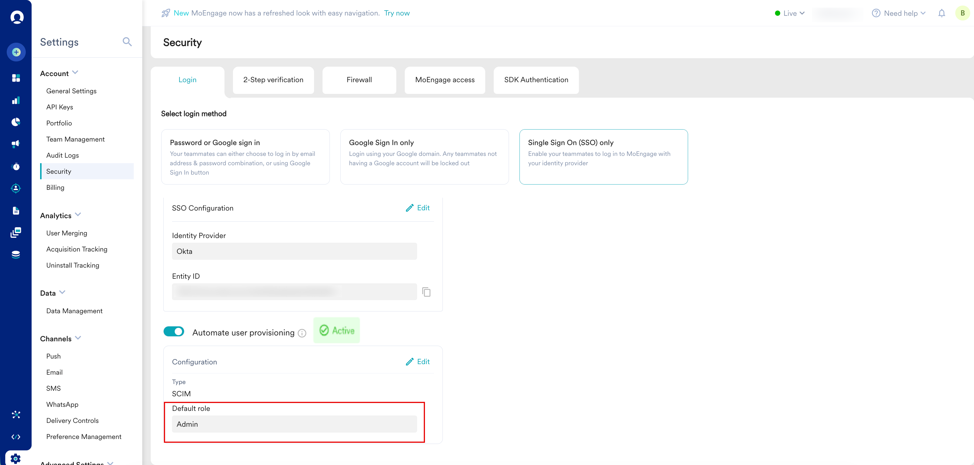 - Centralized role assignment: Assign MoEngage roles, such as default and custom roles, directly from your organization's identity provider.
