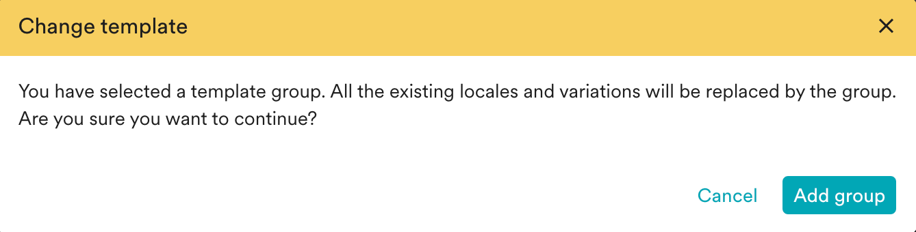 Click Add group to replace all the existing locales and variations with the new group selected.When you select an individual template, the Change template pop-up is displayed, prompting you for confirmation.