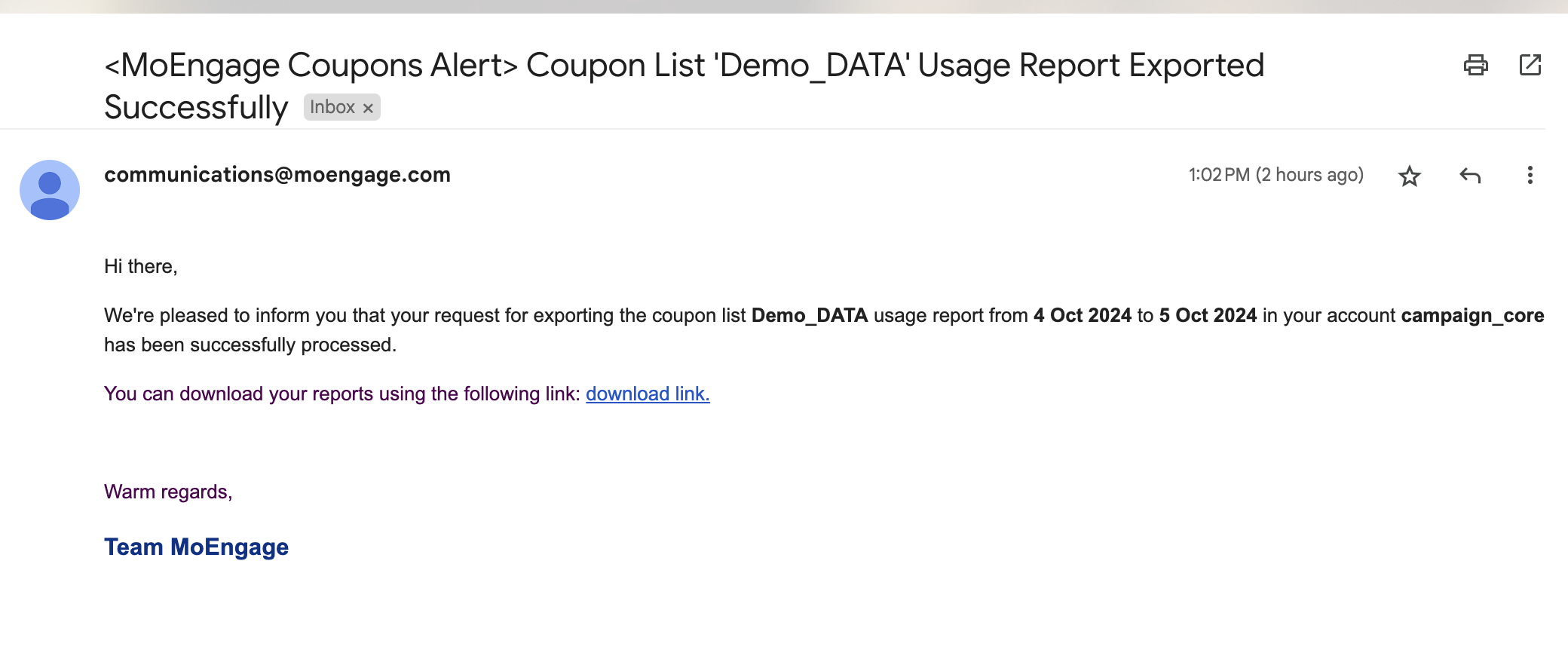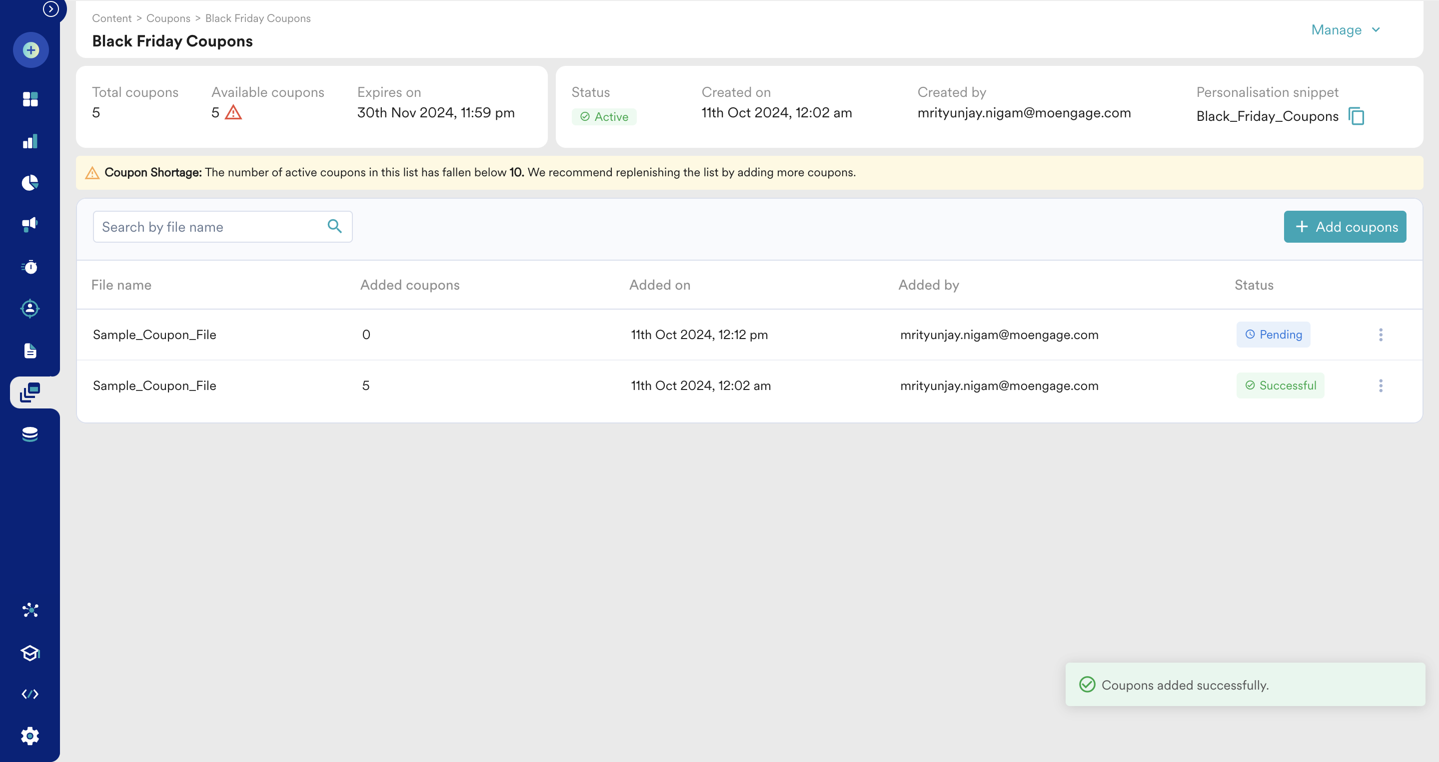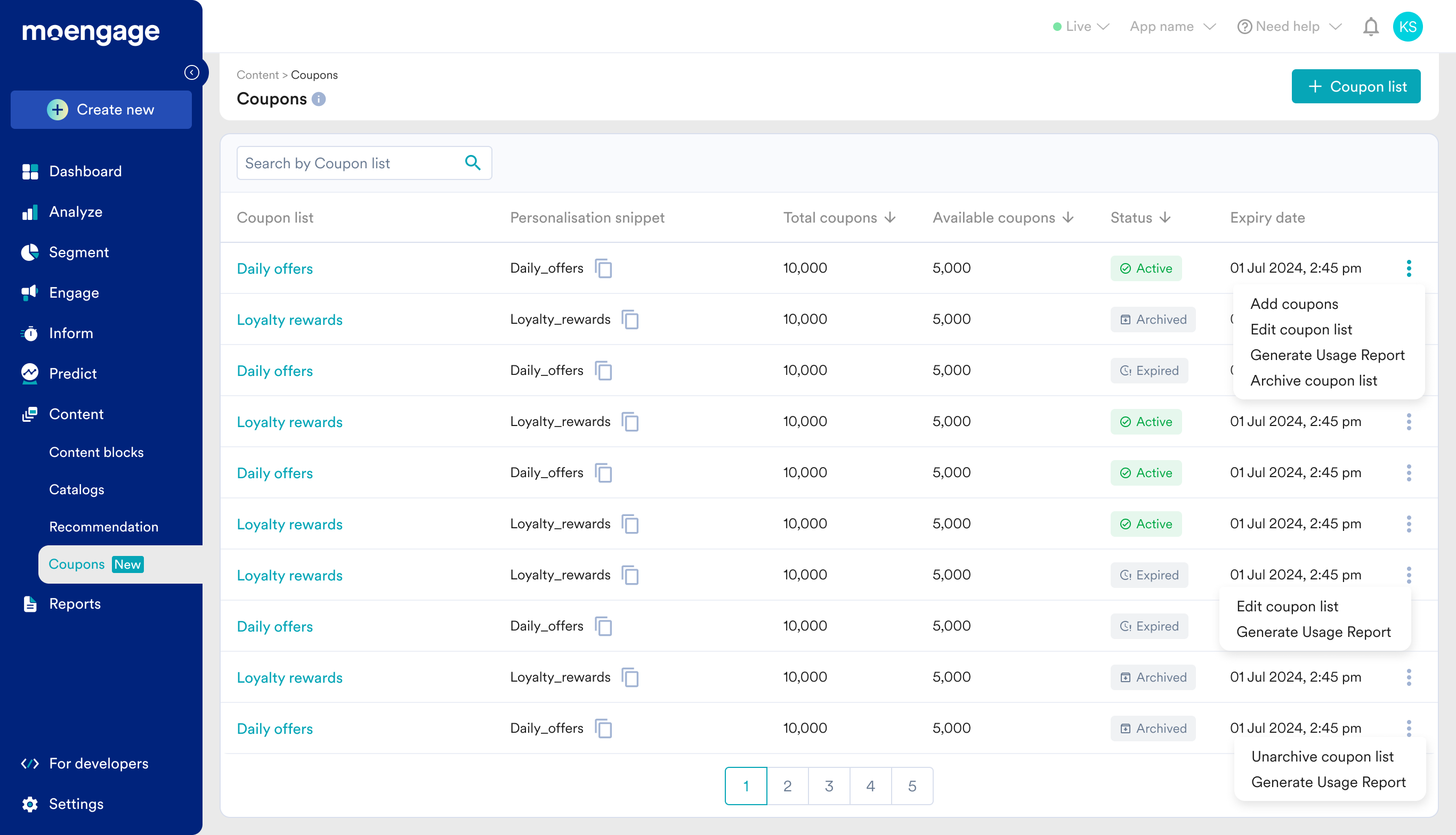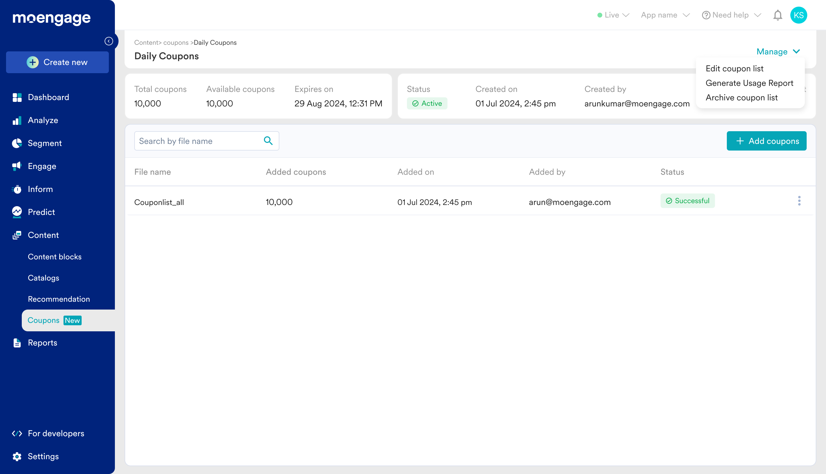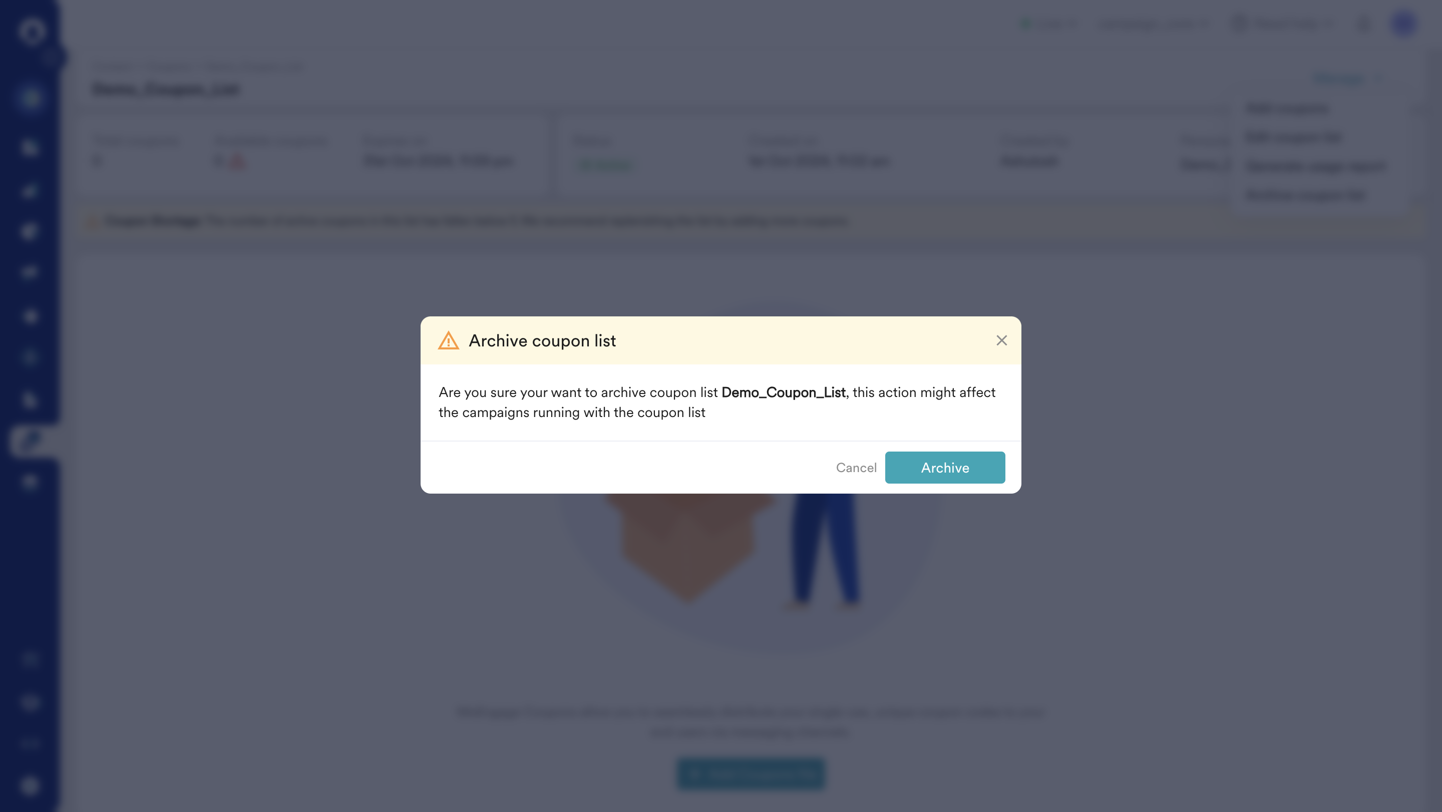Once the list is archived, all the available coupons will be removed from the MoEngage system. As a result, any campaign that refer to this coupon list will not be able to retrieve any code.