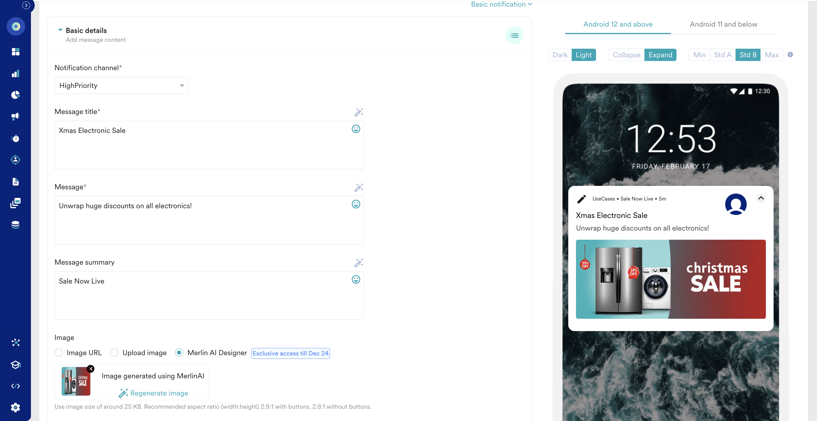 Note Merlin AI Designer is currently supported in Push campaigns for basic and stylized basic templates. |