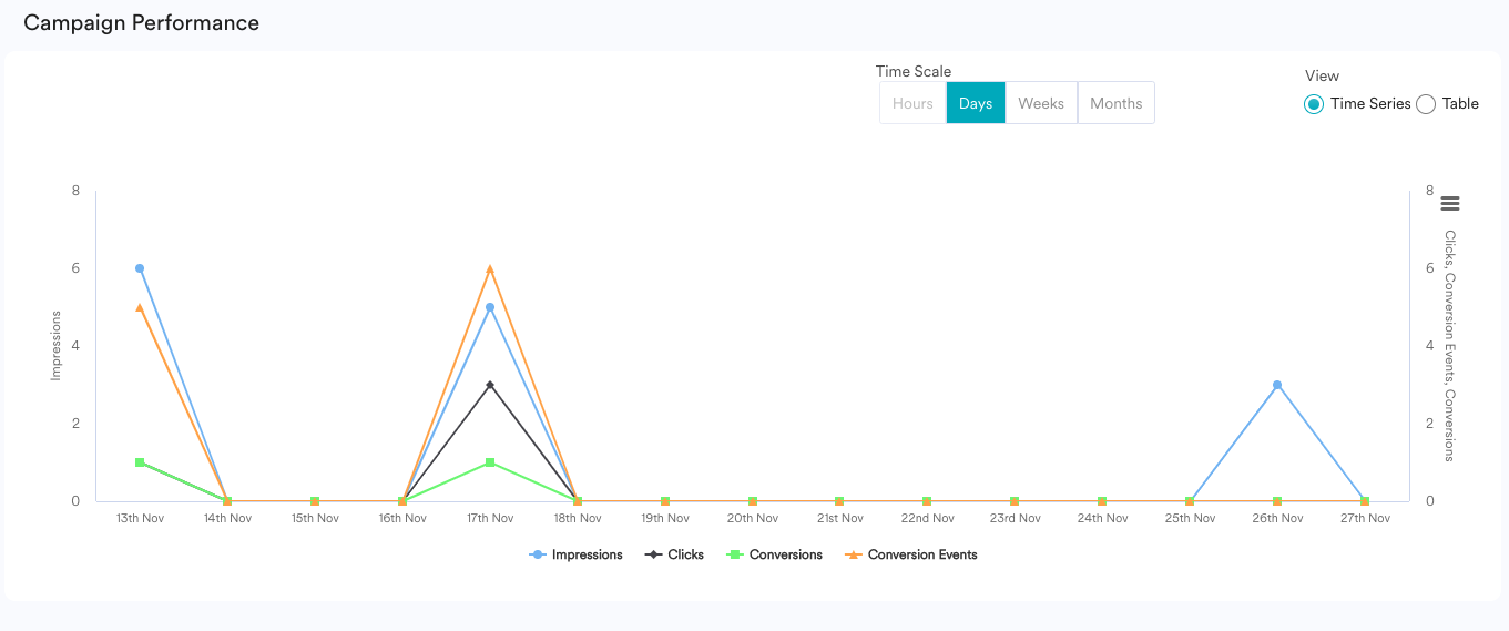 - You can view the impressions, clicks, conversions, and conversion events for campaign performance. These are similar to the ones mentioned in the aggregate campaign statistics section above.