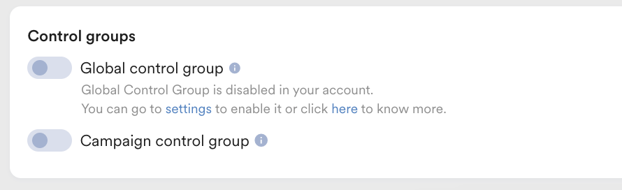If your admin has enabled the global control group for your workspace, the Global control group toggle is turned on by default in the control group section. That means the users in the control group will not receive the communication from this campaign.