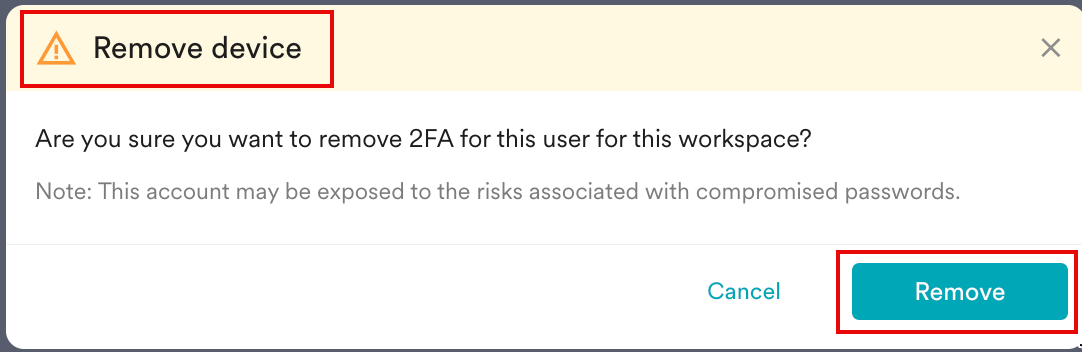 The Remove device pop-up window appears, prompting you for confirmation to remove 2FA for your workspace. - Click Remove.