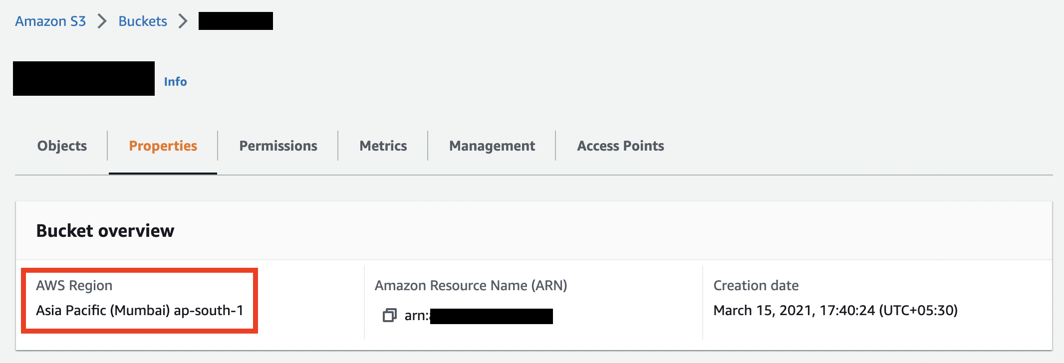 How to find this: You can find the region of your bucket under the bucket's Properties. Example: |