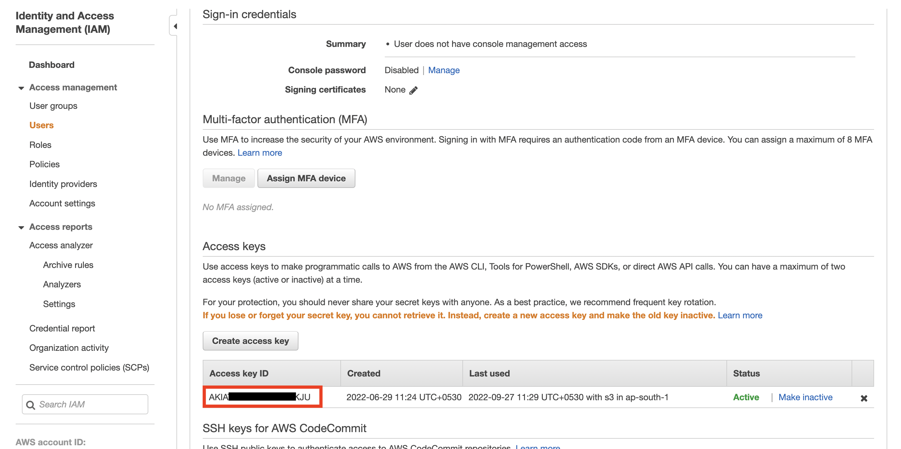 You can either choose to provide the Access Key ID of an existing user (programmatic access or console access) or create a new user with Programmatic Access just for MoEngage. How to find this: n your AWS Console, go to IAM Console >> Users. You can manage your keys for each user here. For an existing user, under the "Security credentials" tab, scroll down to the "Access keys" section. Either copy an existing access key or create a new one (recommended). Enter the Access Key ID here. Example: |