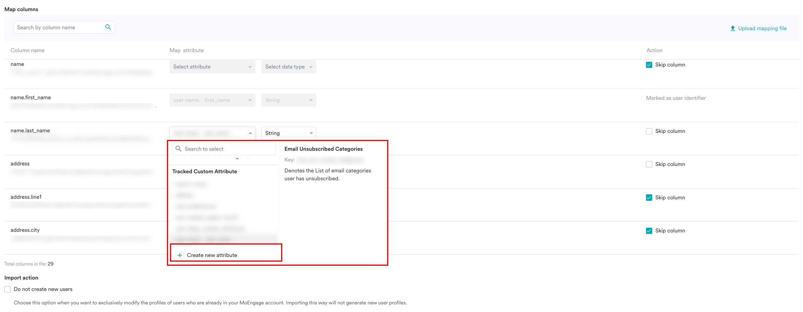 - Map column to attribute: You must select which MoEngage attribute you want to map the column to. You can also choose to create a new attribute. Some attributes support ingestion from multiple data types, so you need to pick the data type of the column as well. For the "DateTime" columns, you also need to pick the format. For the "DateTime" columns, you also need to pick the format.