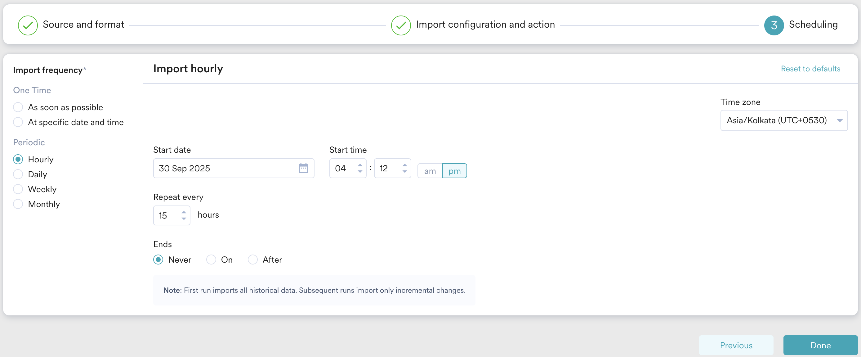 - Periodic: You can run your imports hourly, daily, weekly, or monthly, or with intervals and advanced configurations.