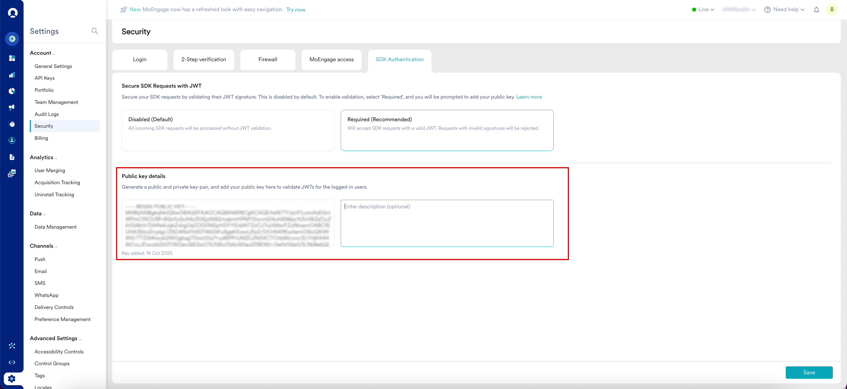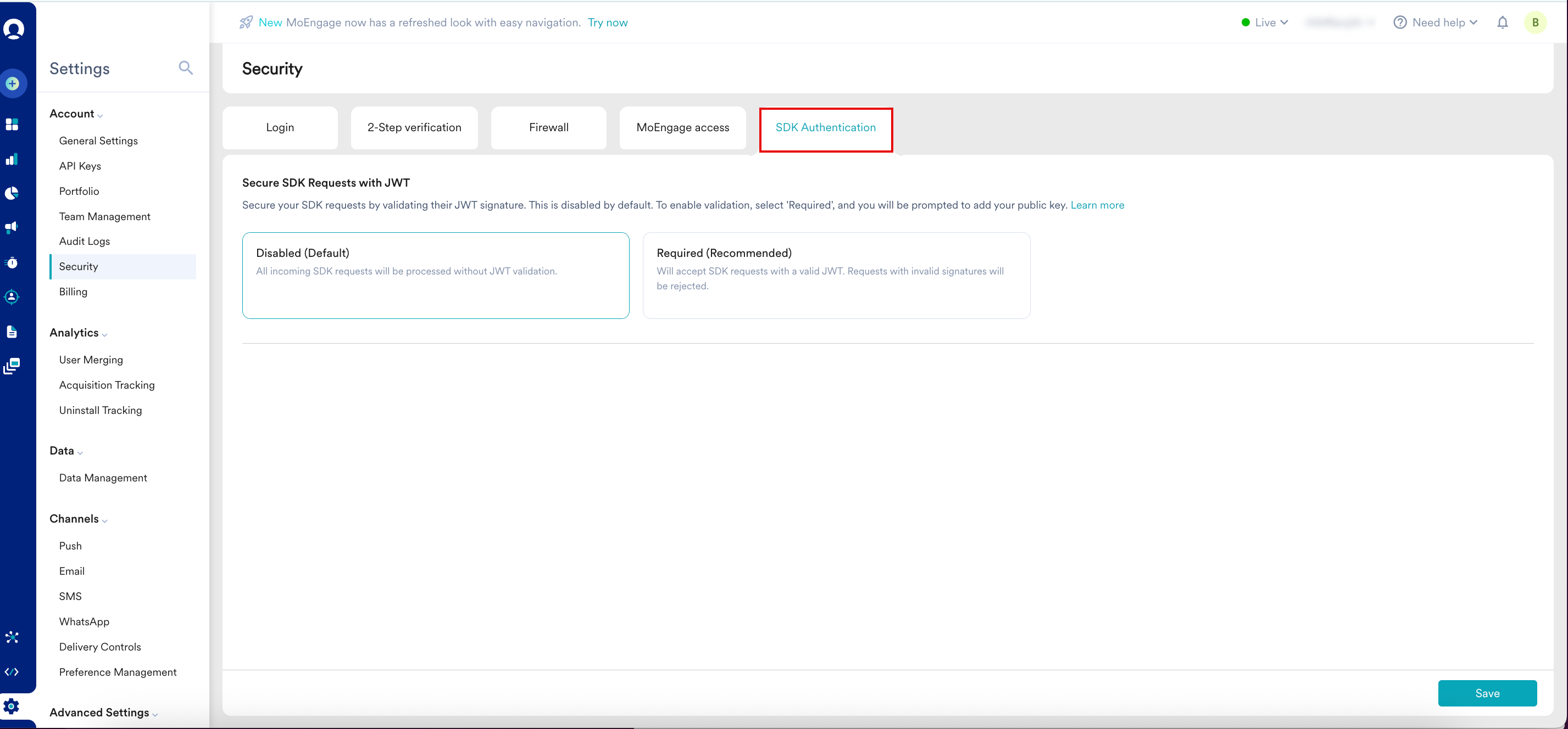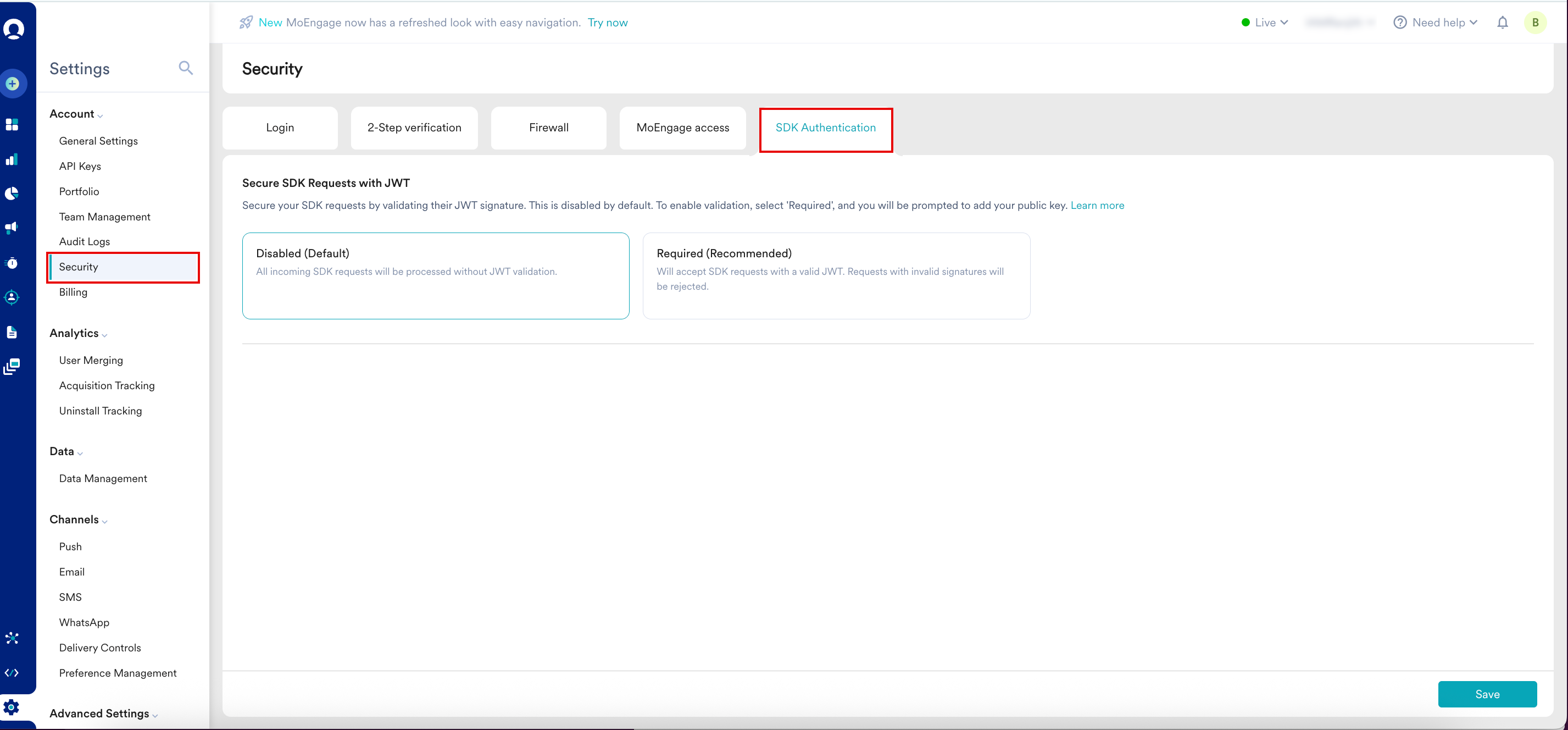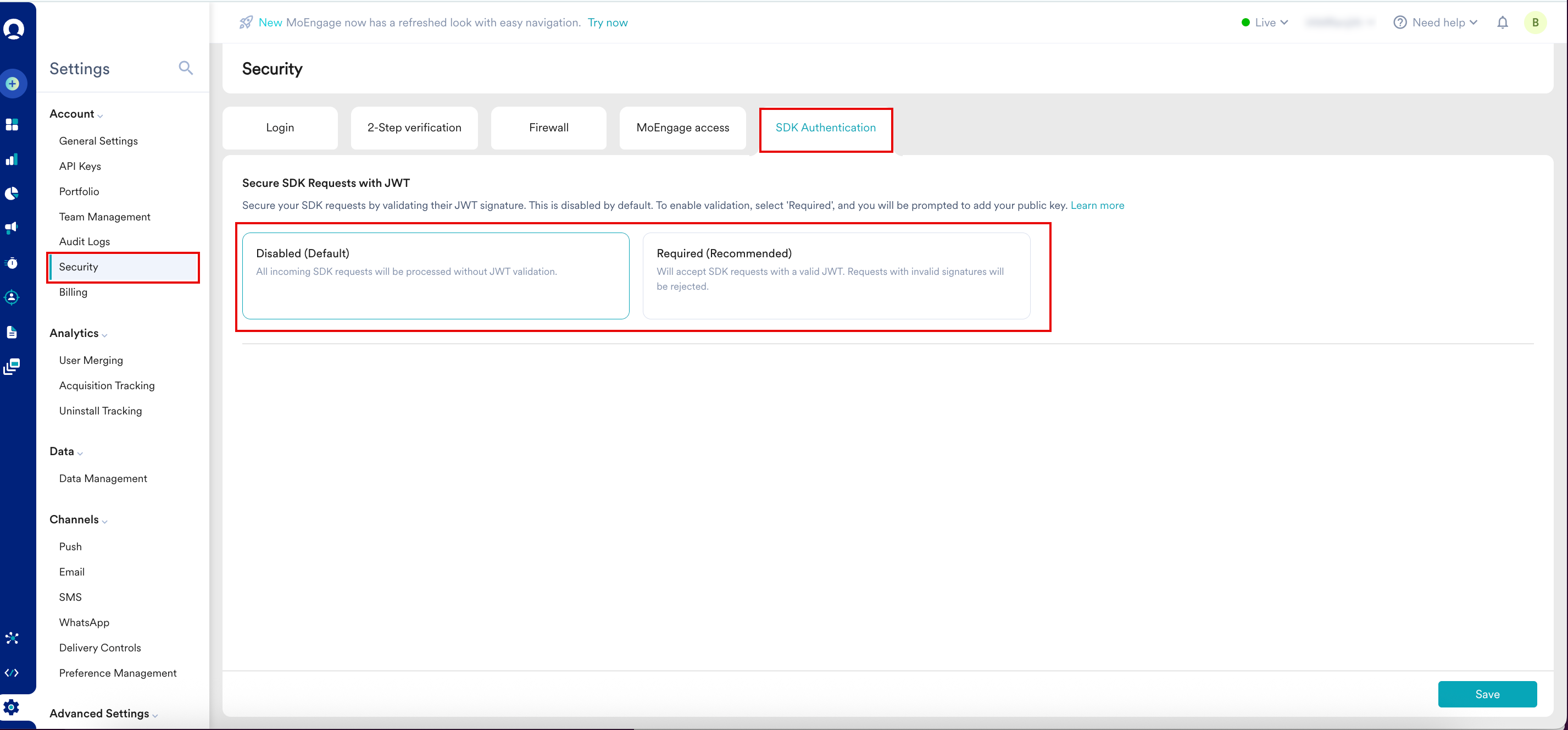 MoEngage recommends Required (Recommended) mode. Before you enable Required (Recommended) mode, ensure your development team has fully rolled out the updated app to your users. After this mode is active, any data sent from older app versions that do not have the JWT signature will be permanently blocked.