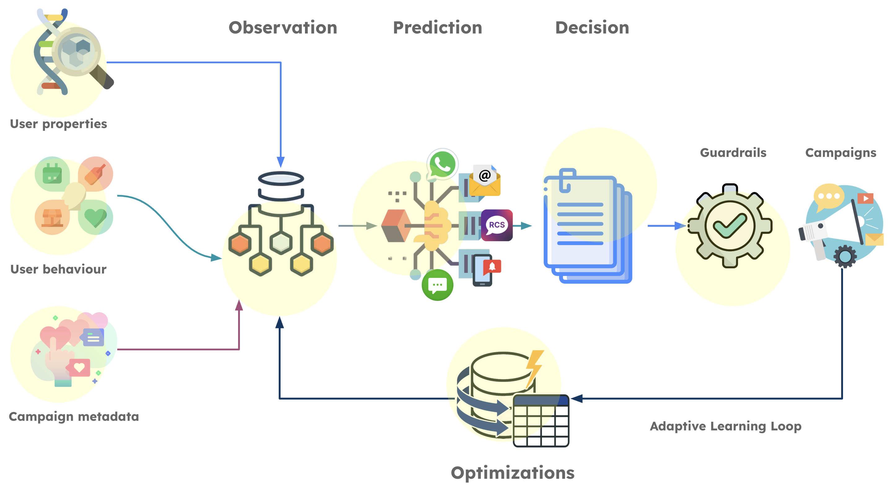- Observation: The agent gathers the current state of the user to model intent. It analyzes user properties, aggregated behavior (such as purchase frequency and average order value), and the semantic similarity of campaigns. This calculates how closely campaign content aligns with the evolving interests of both the individual and their lookalike audiences.