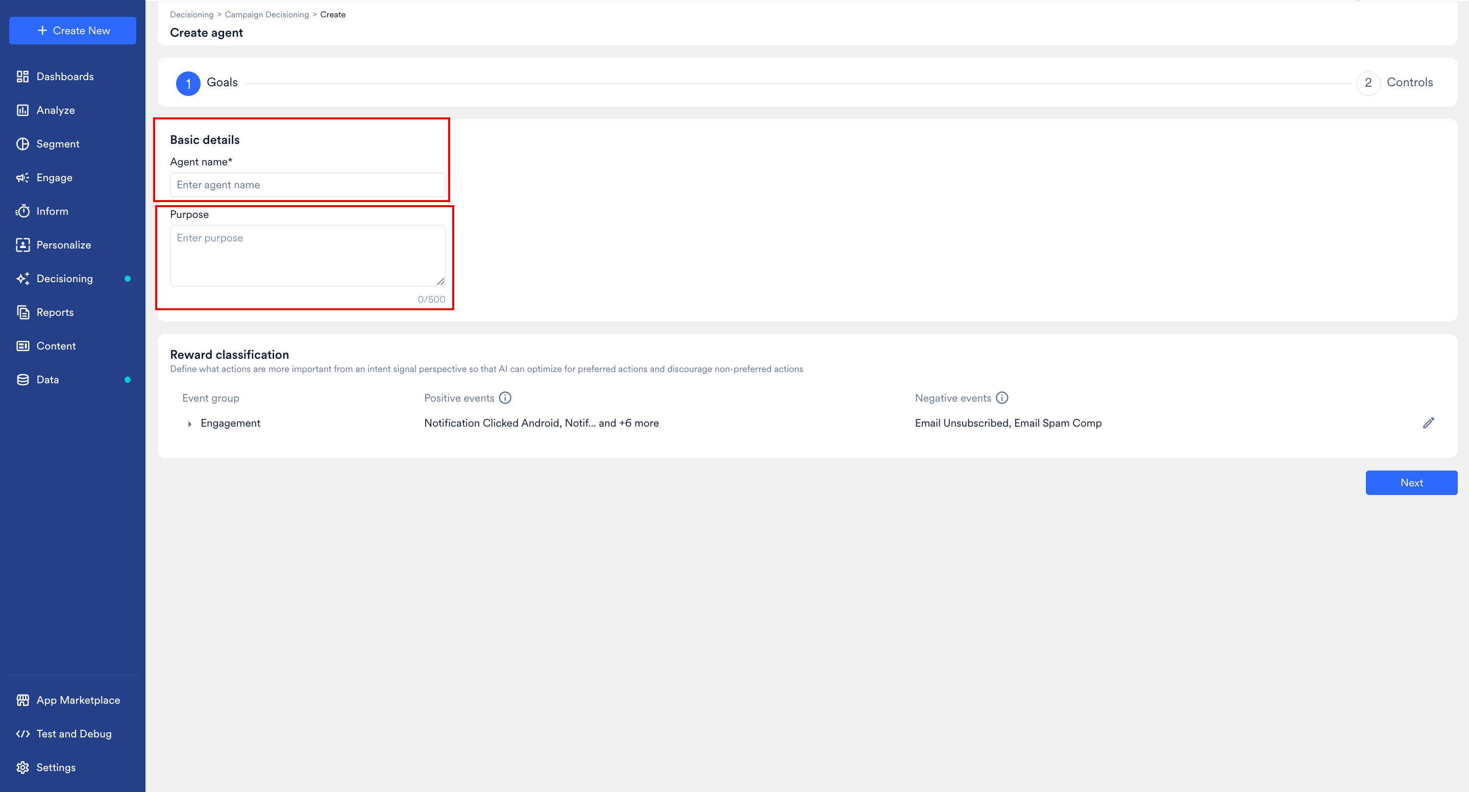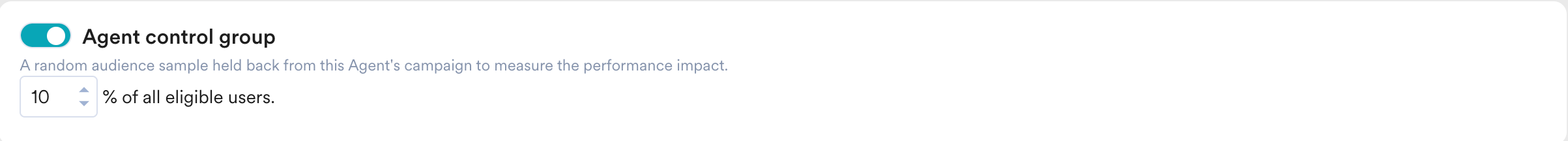 Agent Control Group: Turn this toggle on to set aside a random sample of users (for example, 10%) who will not receive communications. This serves as a baseline to measure the AI's actual impact.