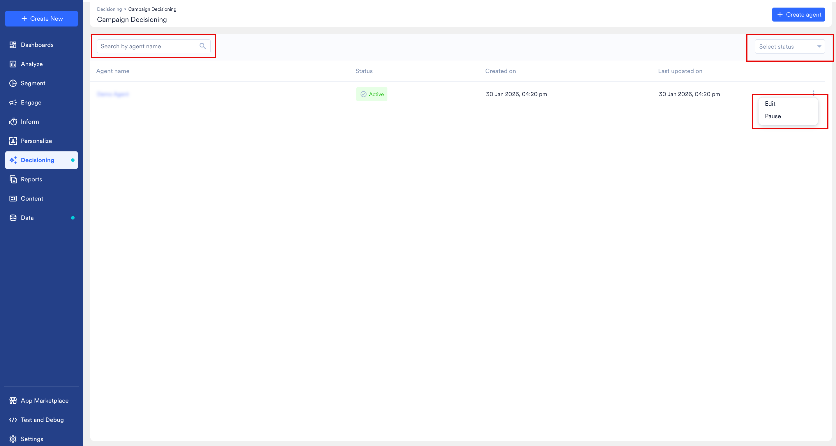 Pause and resume: Click the ellipsis (⋮) icon and select Pause to stop the Agent's decisioning logic temporarily.