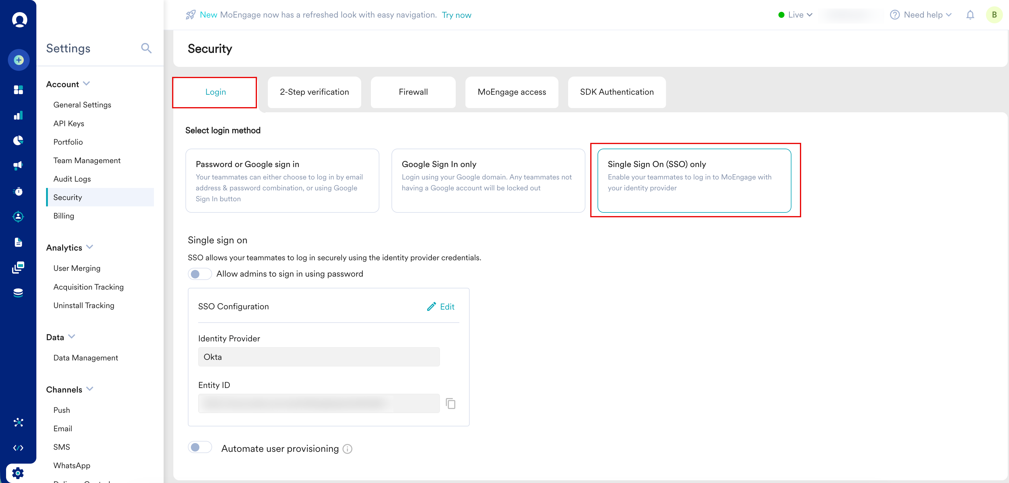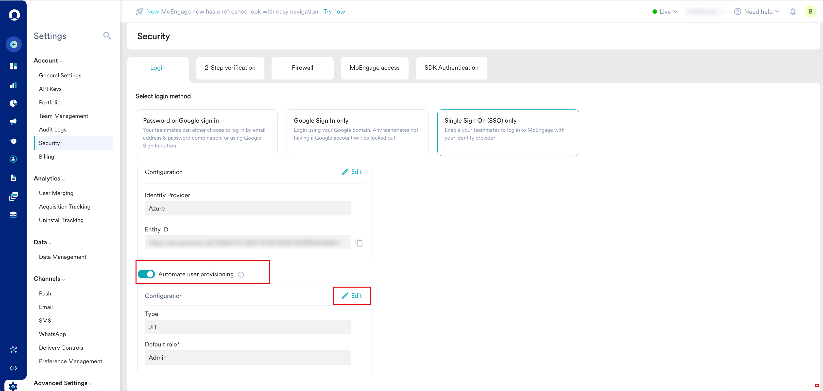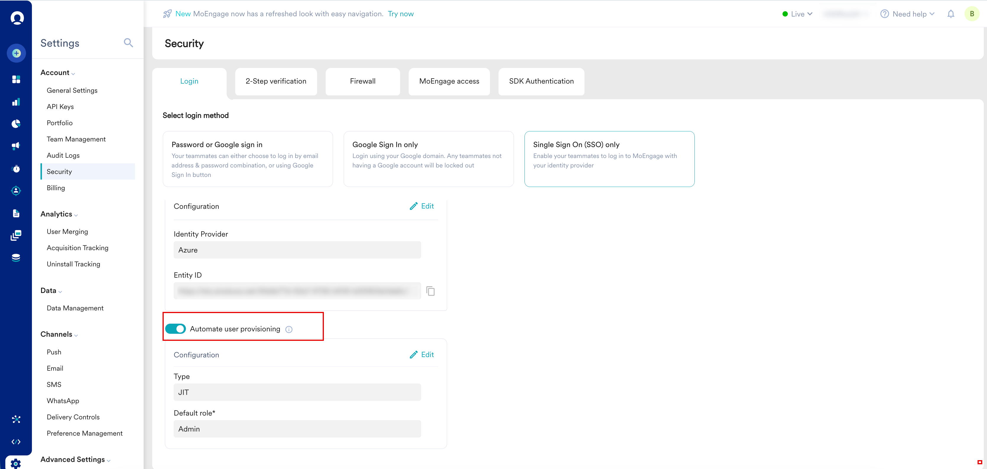 - Seamless onboarding: New team members can access MoEngage immediately without waiting for a manual invitation.