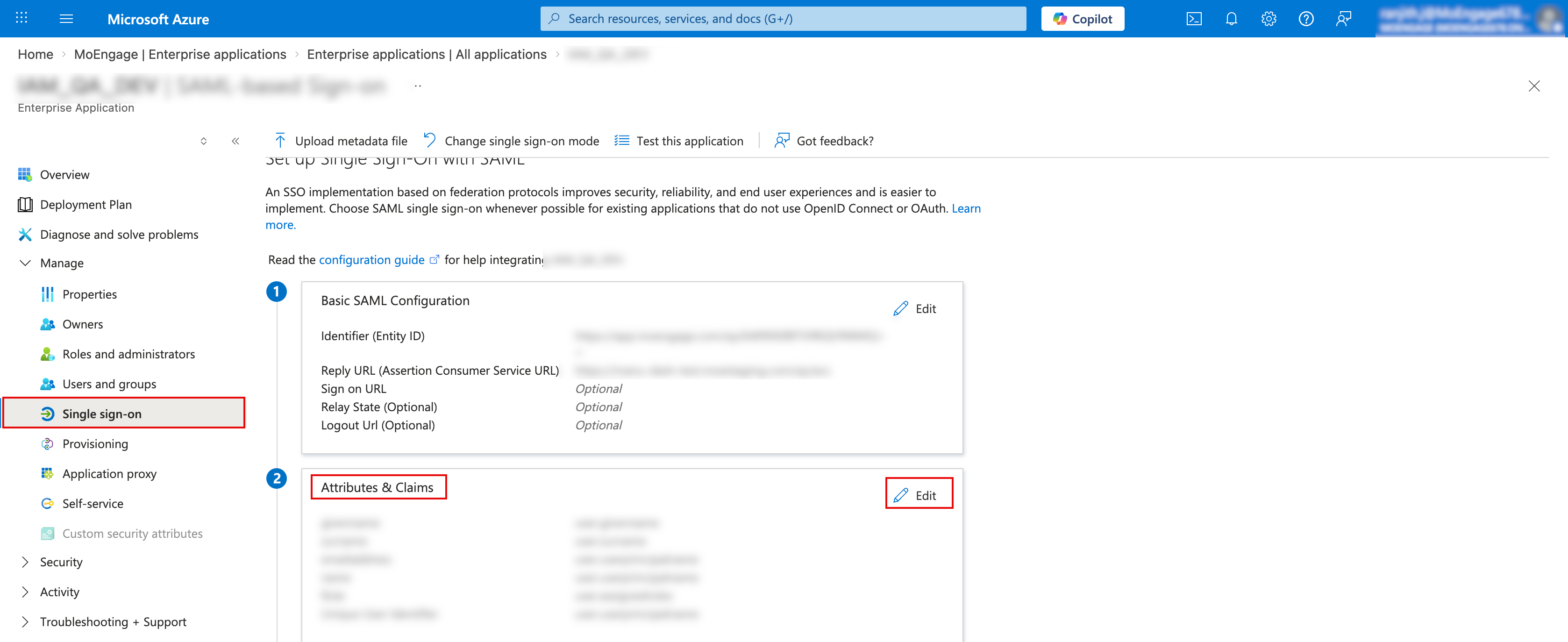 - On the left navigation menu, click Single sign-on and then click Edit in the Attributes & Claims section.