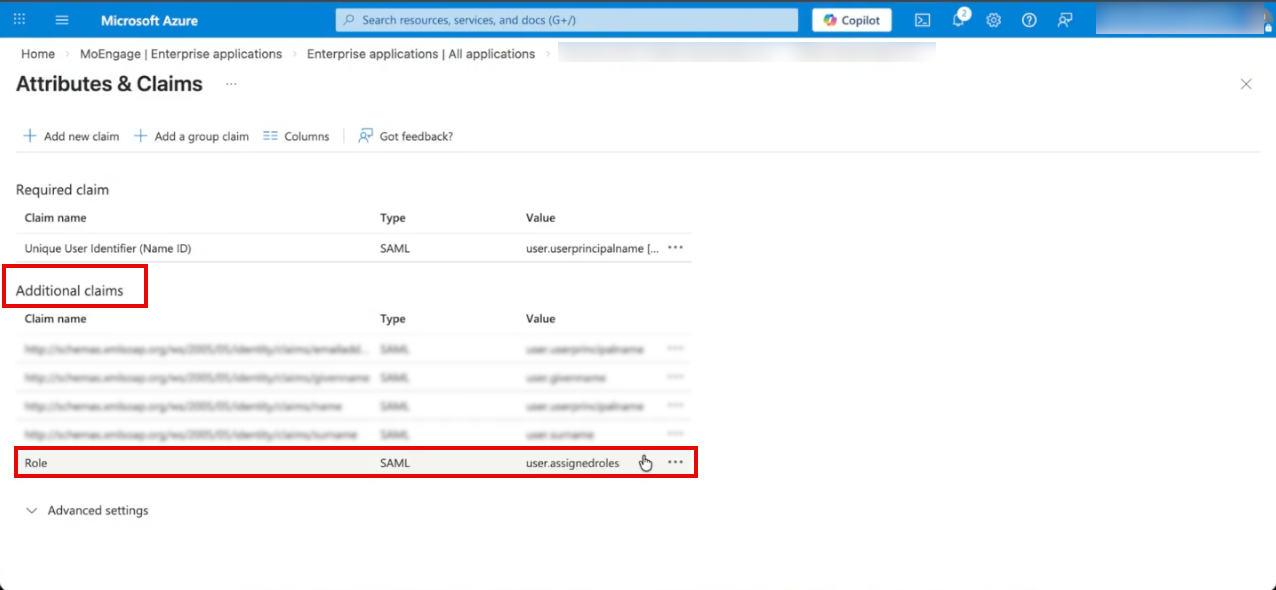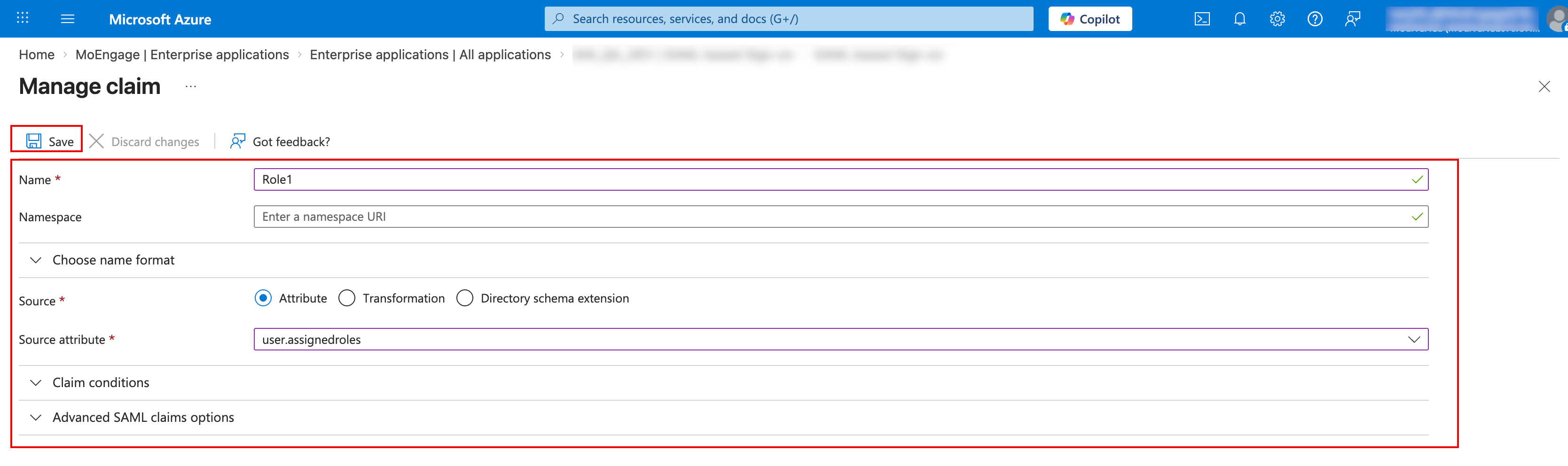 Note: Claim name must be unique.Name format Optional Leave it blank. Source Yes Select the Attribute checkbox. (This is selected by default. Source attribute Yes Click user. assignedroles in the drop-down list. - Click Save.