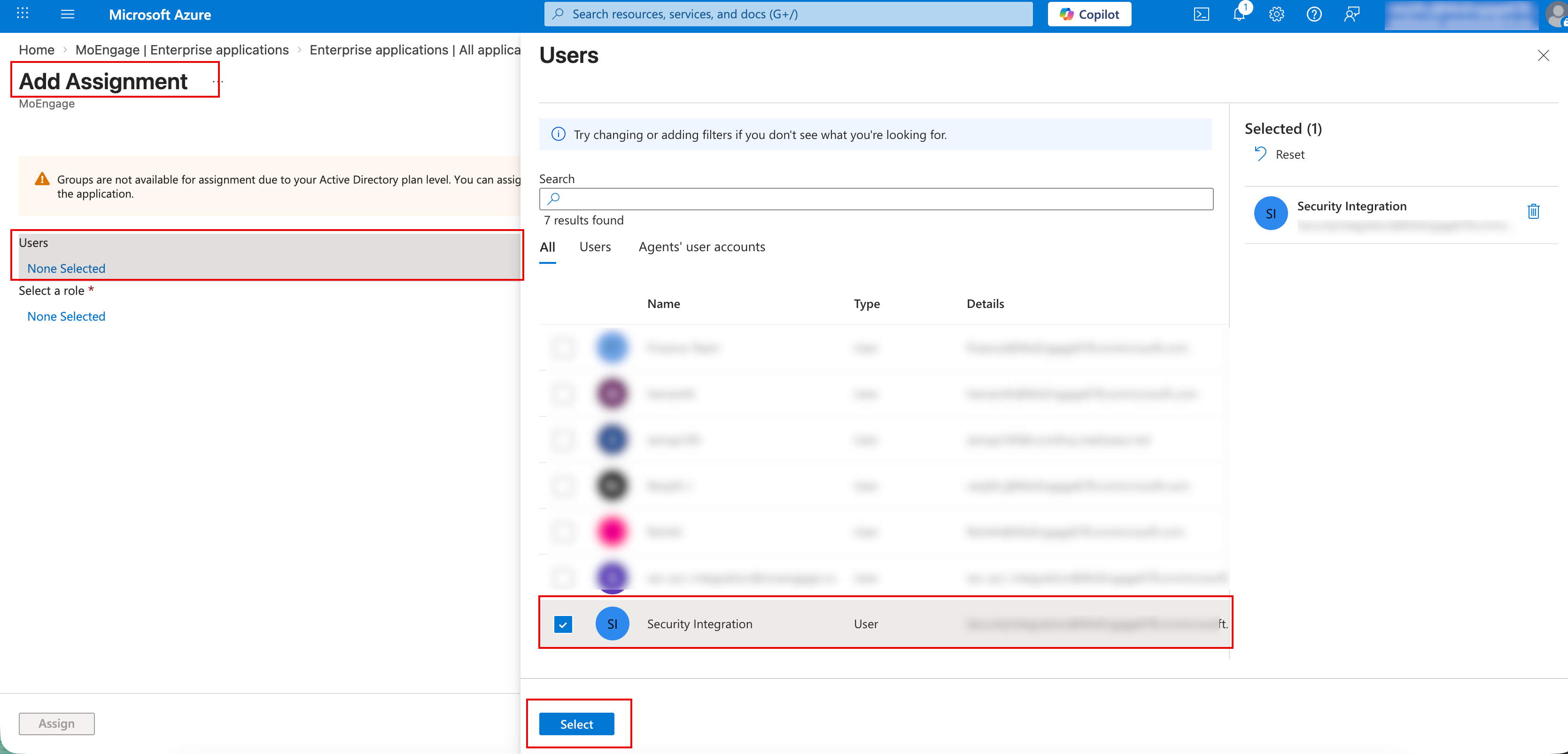 - Select the required user checkbox (for example, Security Integration) and click Select.