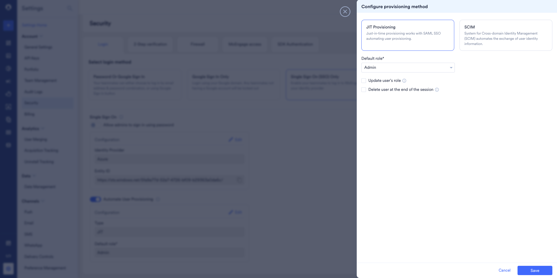 Just-in-Time User Provisioning lets you automate the creation and management of users in your MoEngage workspace. This feature offers easier and quicker user creation directly from your Identity Provider.